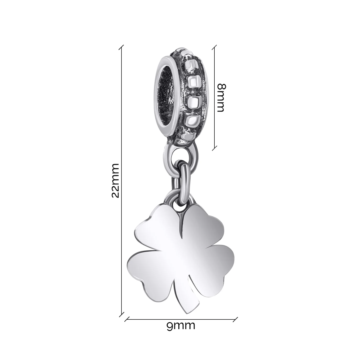 Шарм зі срібла з підвісом «Конюшина» — ювелірний виріб, який може стати центральною частиною жіночого браслета. Оригінальна форма та класичне виконання роблять його універсальною прикрасою. Виготовлений шарм зі срібла 925 проби. Складається з кільця та з'єднаної з ним підвіски у формі чотирилистої конюшини. Шарм можна носити як на руці (з браслетом), так і на шиї (з ланцюжком із такого ж дорогоцінного металу). Конюшина символізує удачу, успіх, любов і здоров'я, тому ювелірний виріб може стати не просто прикрасою, а ще й талісманом.