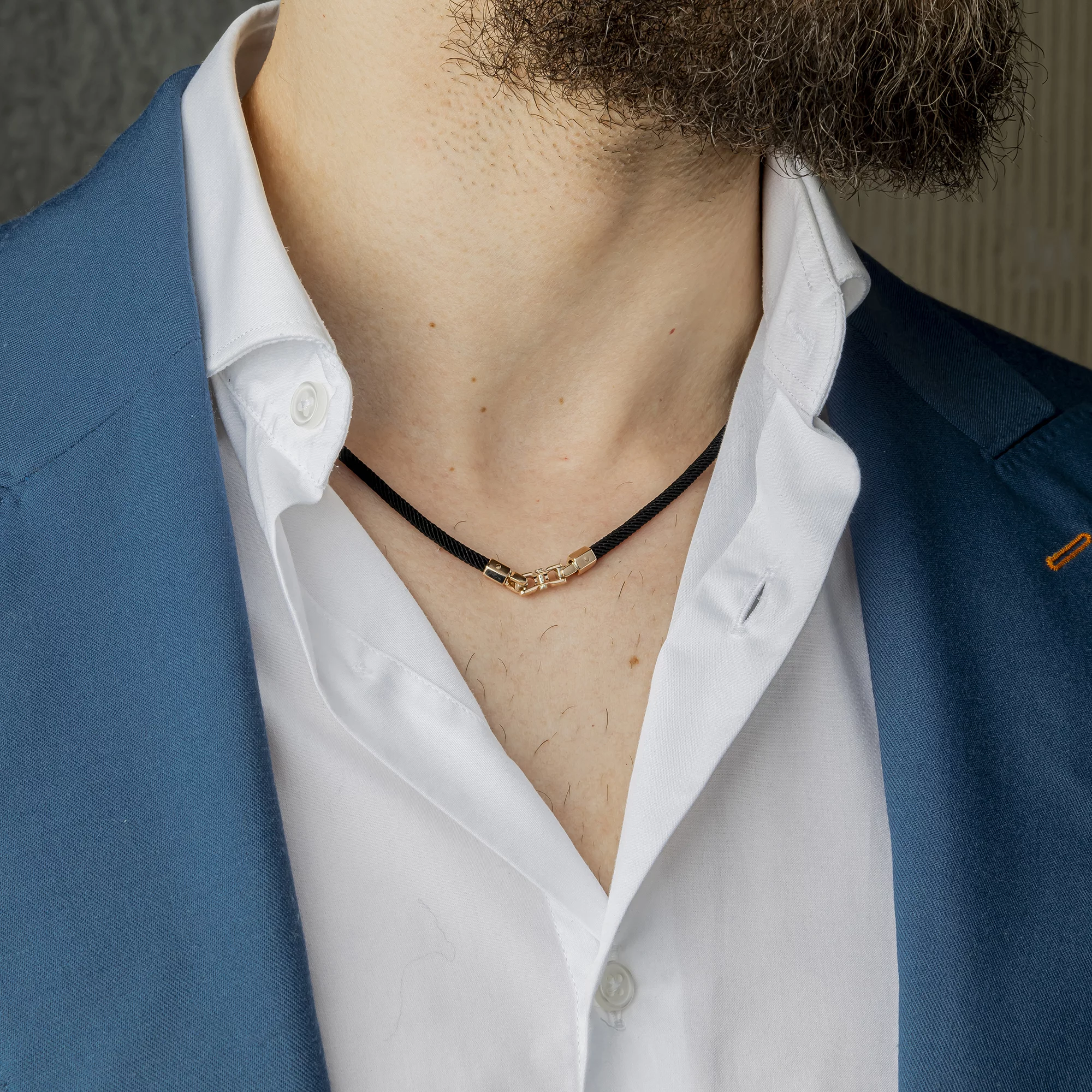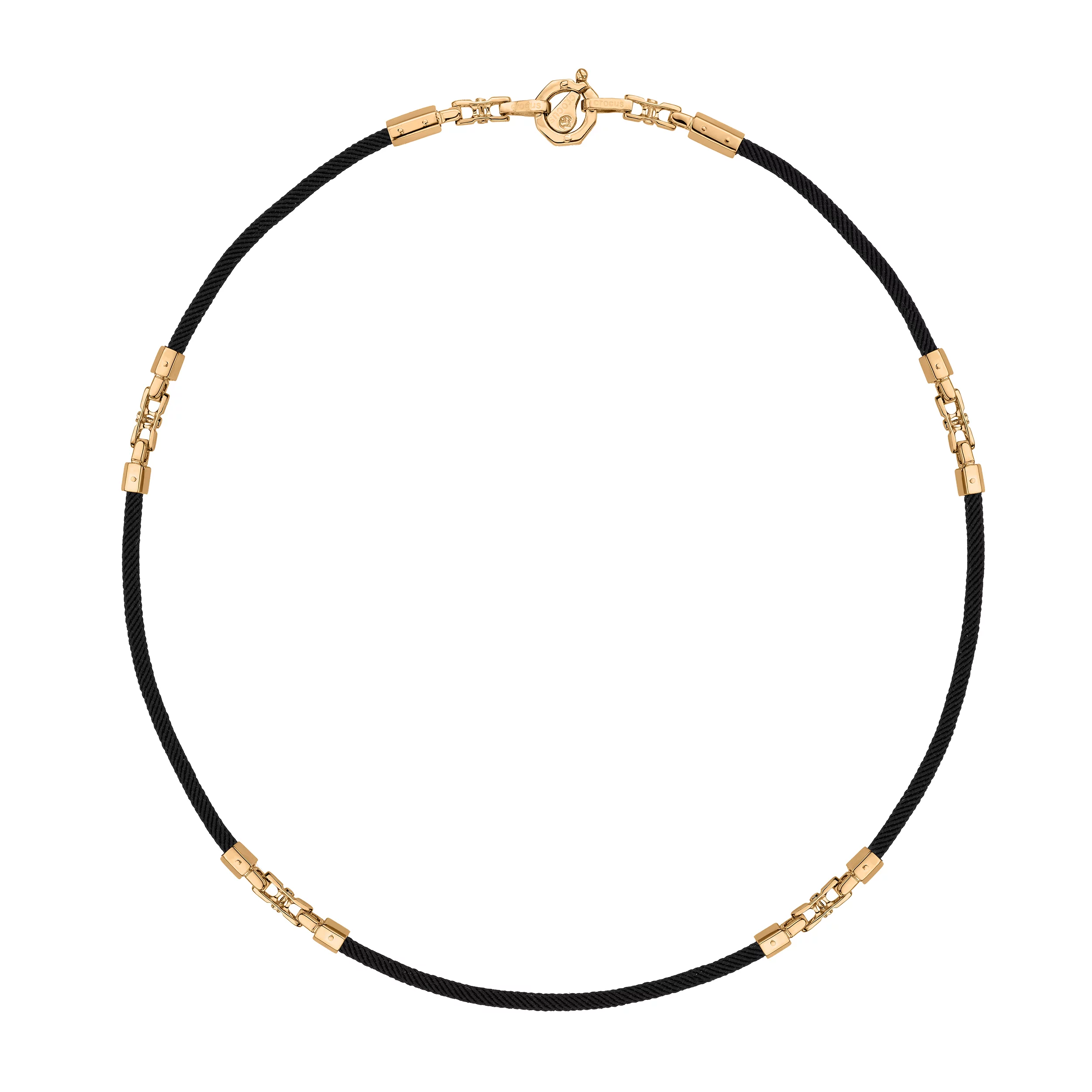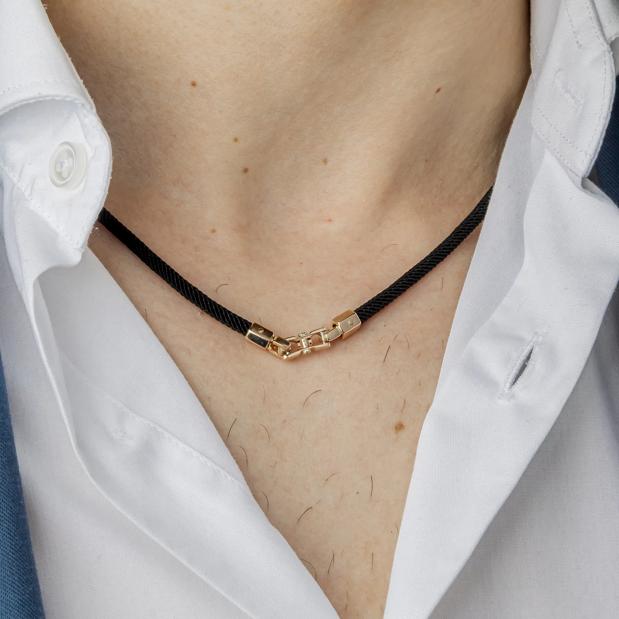 Жіночий ювелірний шнурок з бавовни із застібкою і вставками з червоного золота 585 проби. Натуральний матеріал не натирає шкіру, не тисне, не викликає алергій і подразнень. Виріб фіксується шпрингельним замком. Застібка складається з кільця, яке відкривається невеликим важелем на пружинному механізмі. Фіксатор прикрашений невеликим цирконієм, він додає сяйва дорогоцінній основі. Ювелірний шнурок виконаний у класичному стилі. Його легко комбінувати з повсякденними образами, можна поєднувати з діловими костюмами та строгим вбранням.
