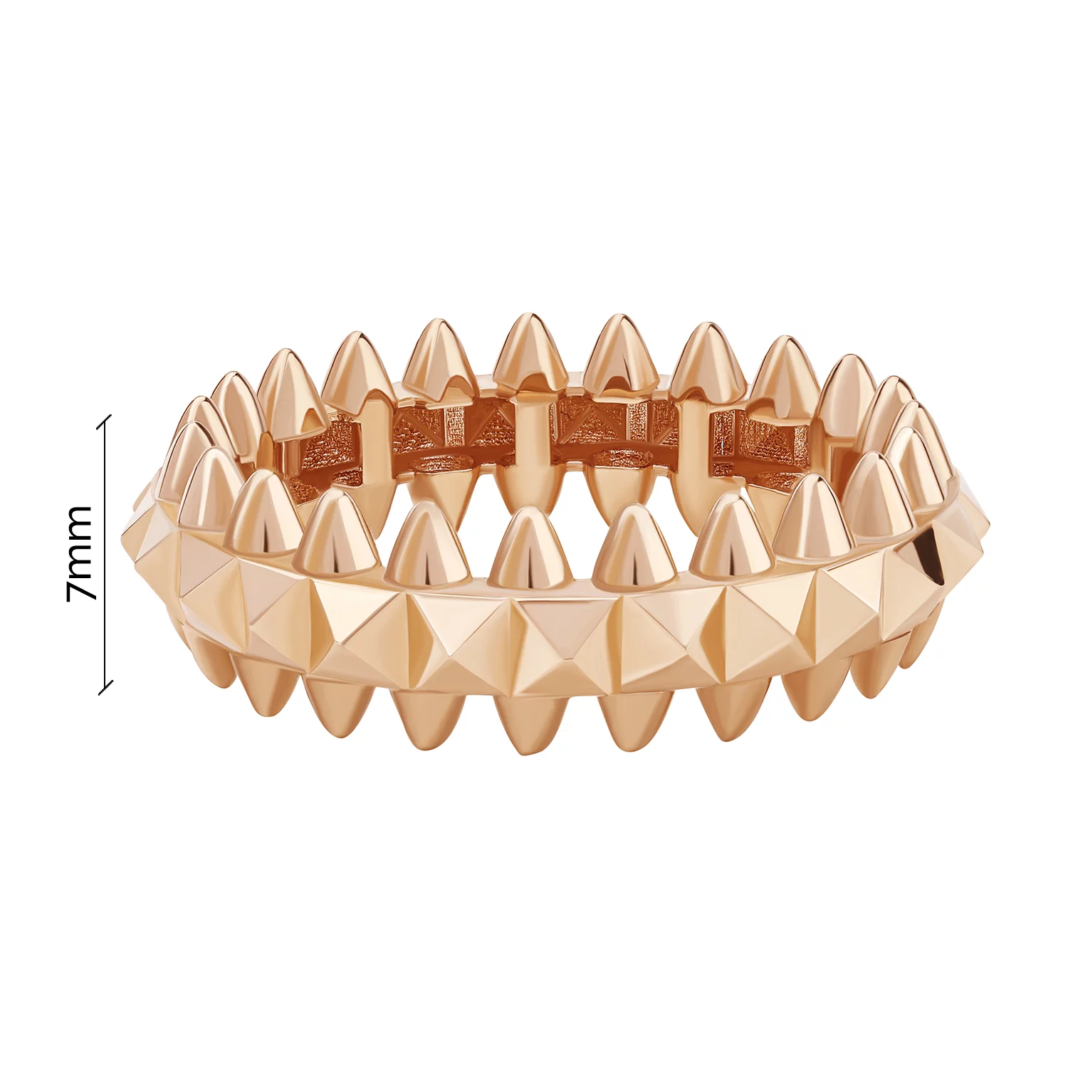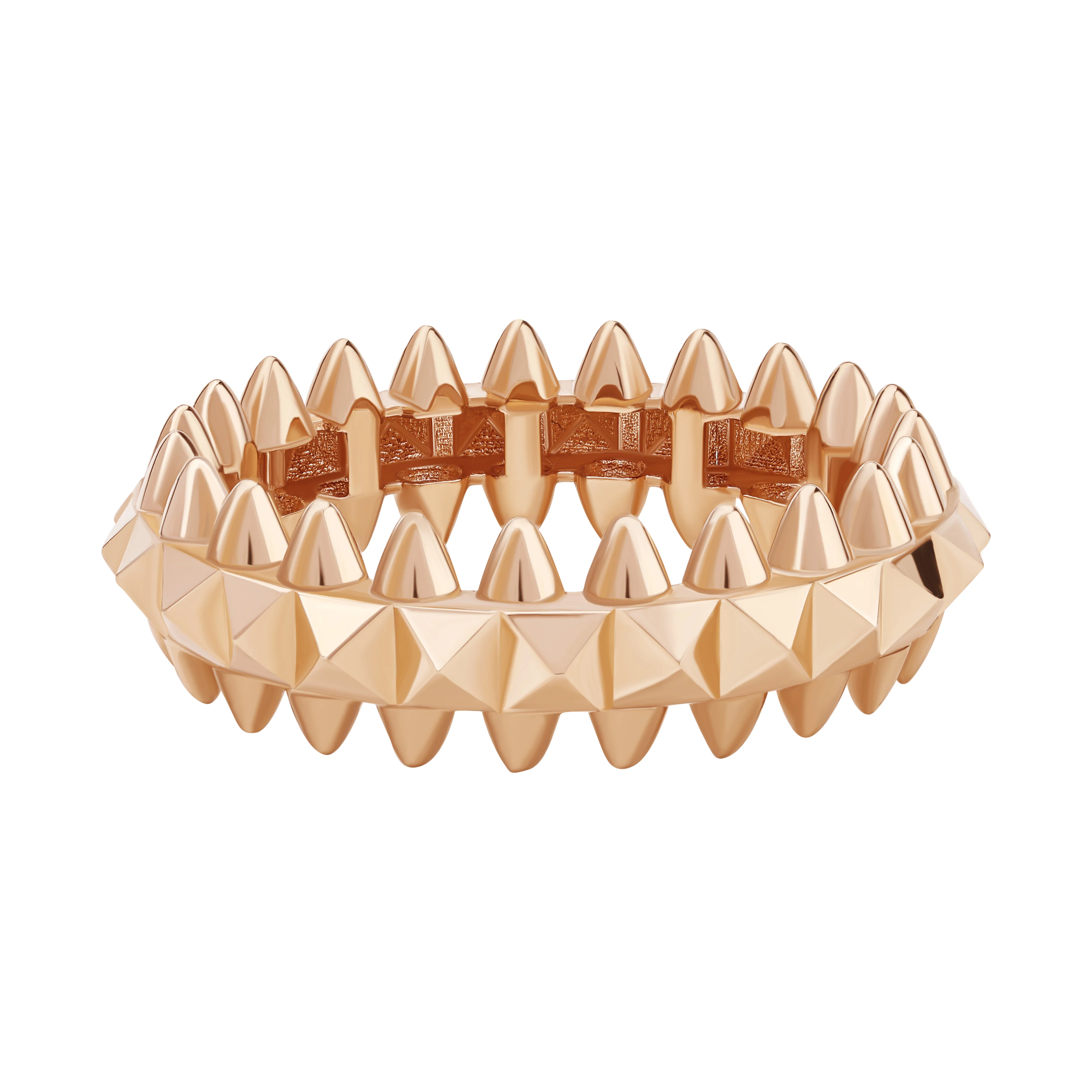 Сучасна каблучка Clash у червоному золоті — оригінальна прикраса для жіночих пальців, виконана в стилі Картьє. З боків від обідка на всьому колі виробу розташовані шипи, які надають йому войовничості, але без агресії, оскільки закруглені лінії пом'якшують гостроту кутів. Виготовлена каблучка із золота 585 проби з додаванням 9,5% міді до лігатури сплаву, завдяки якій дорогоцінний метал набув червоного відтінку. Її можна носити окремо або разом з іншими ювелірними прикрасами, що поєднуються з виробом за стилем та дизайном.