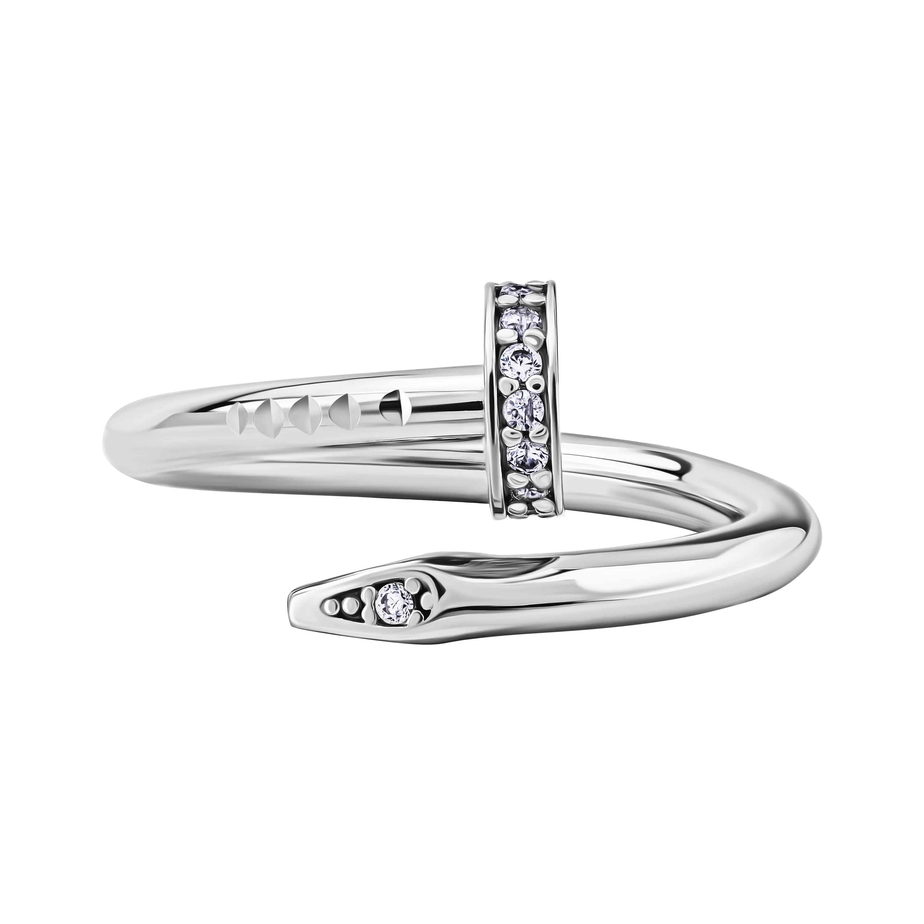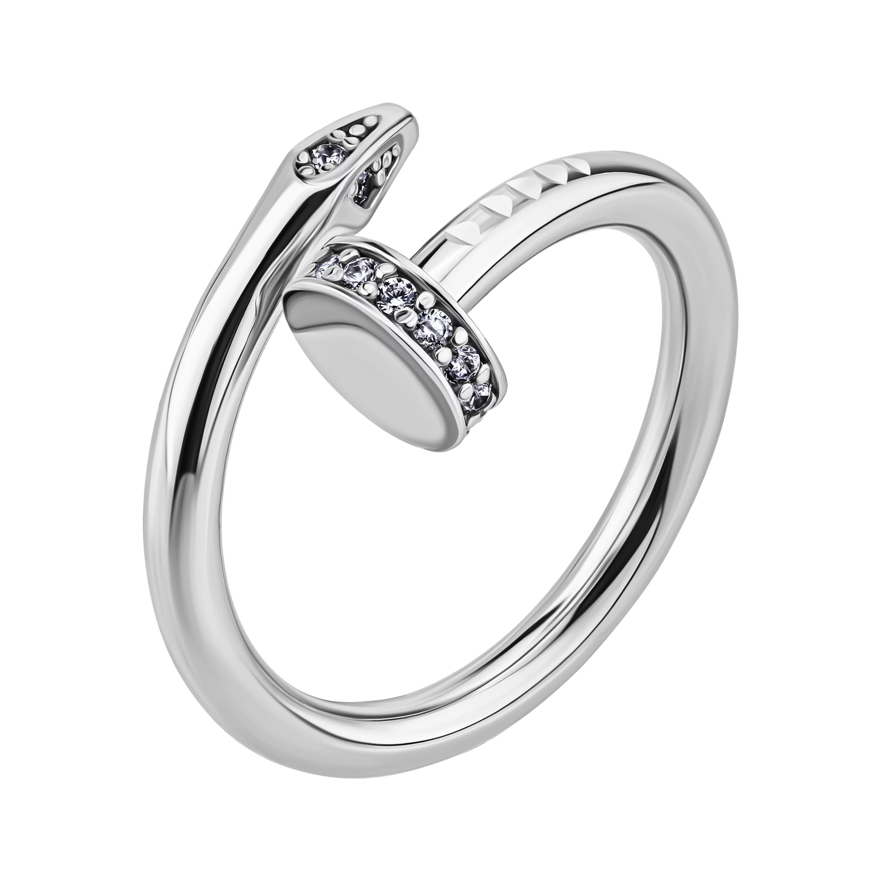 Стильна каблучка «Цвях» із білого золота з доріжкою з фіанітів — прикраса, яка додасть образу оригінальності. Це ювелірний виріб, виконаний у фірмовому стилі Картьє, тому в ньому присутні плавні вигини та чисті лінії. Каблучка зроблена у формі цвяха, що легко та м'яко обвиває палець. Його вістря і капелюшок декоровані фіанітами з круглим огранюванням. Камені відбивають промені світла, створюючи сяйливий ефект, а посилює його блиск білого золота 585 проби, з якого прикраса виготовлена. Такий ювелірний виріб стане подарунком, що запам'ятовується, на будь-яке свято.
