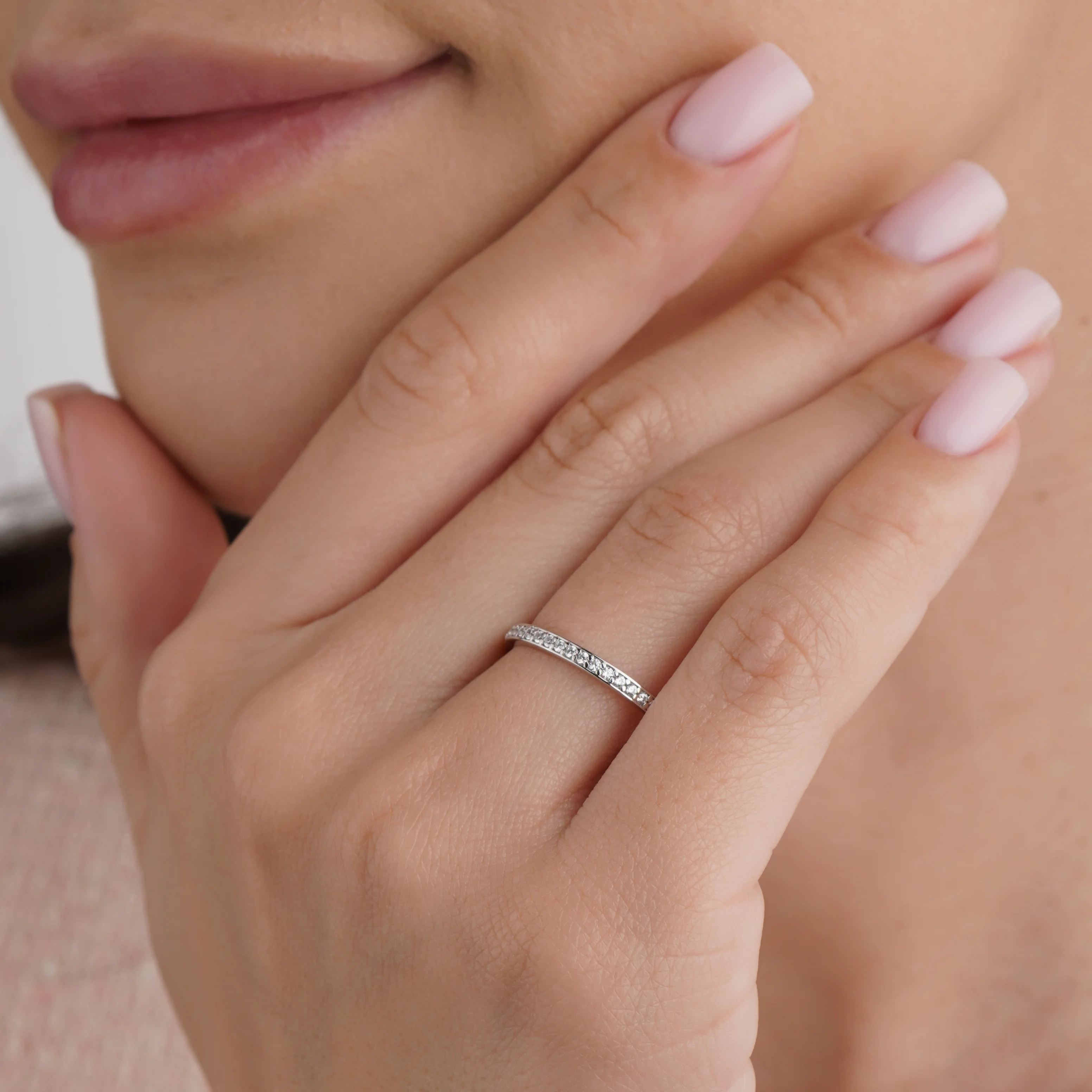Стильна каблучка з білого золота з доріжкою з фіанітів - 1924988