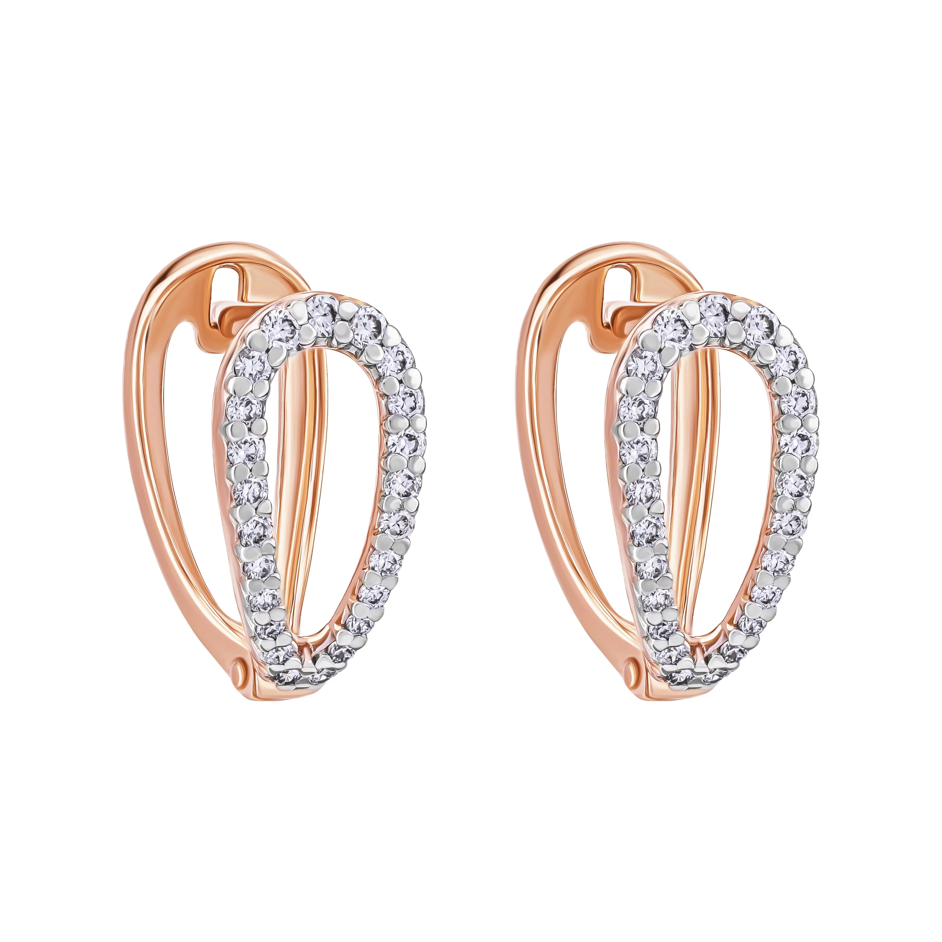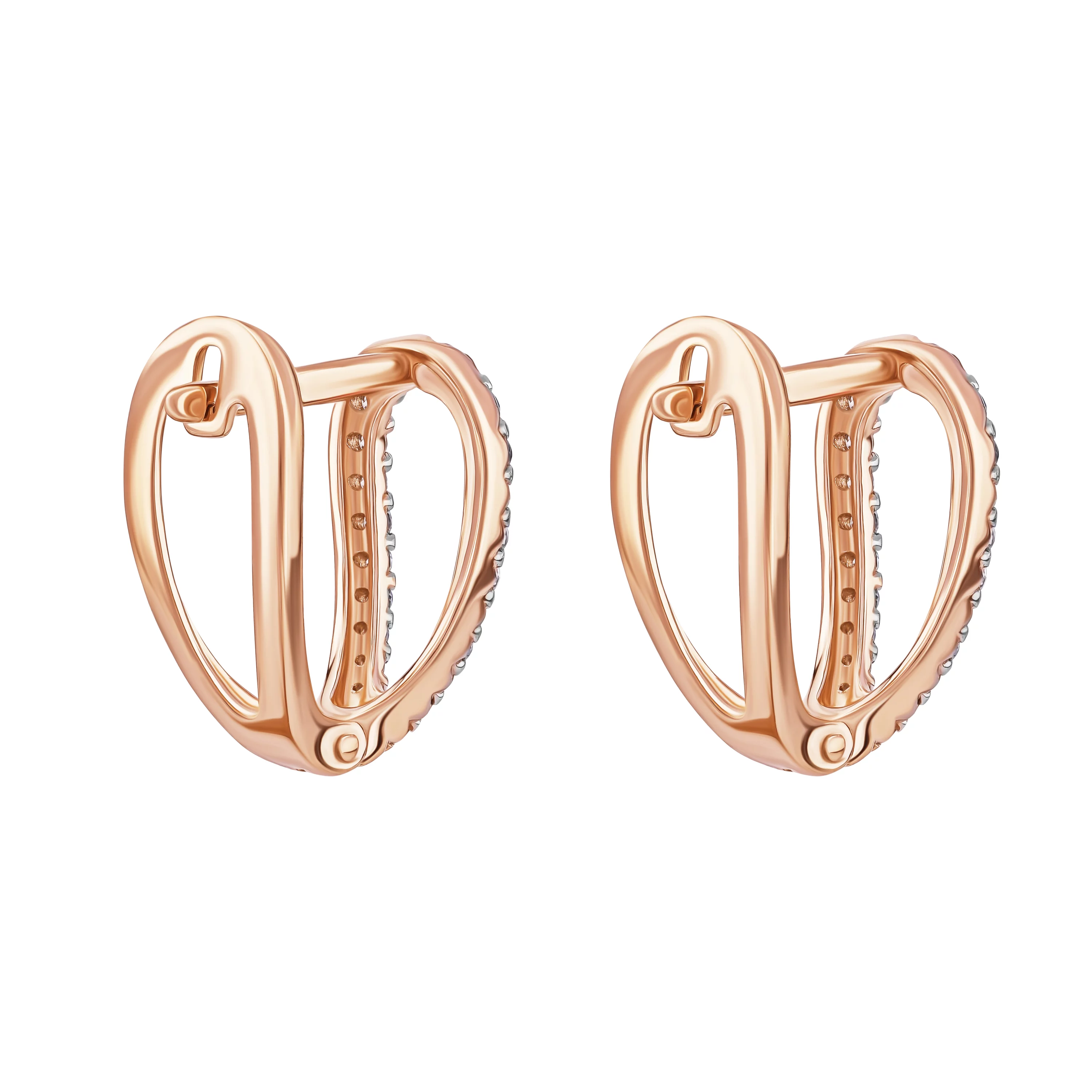 Вишукані сережки з червоного золота 585-ї проби з діамантами привертають увагу елегантною формою перевернутої краплі. Дизайн підкреслює витонченість і жіночність, створюючи гармонійне поєднання шляхетного металу та розсипу блискучого каміння. Доріжка діамантів, що акуратно обрамляє поверхню прикраси, посилює гру світла, додаючи сяйва кожному руху. Граціозний силует та вишуканий блиск роблять цю модель універсальним доповненням як до повсякденного стилю, так і до вечірнього вбрання. Надійна застібка забезпечує комфортну посадку, а класичний, але виразний дизайн дозволить цим сережкам стати прикрасою, яка ніколи не втратить своєї актуальності.
