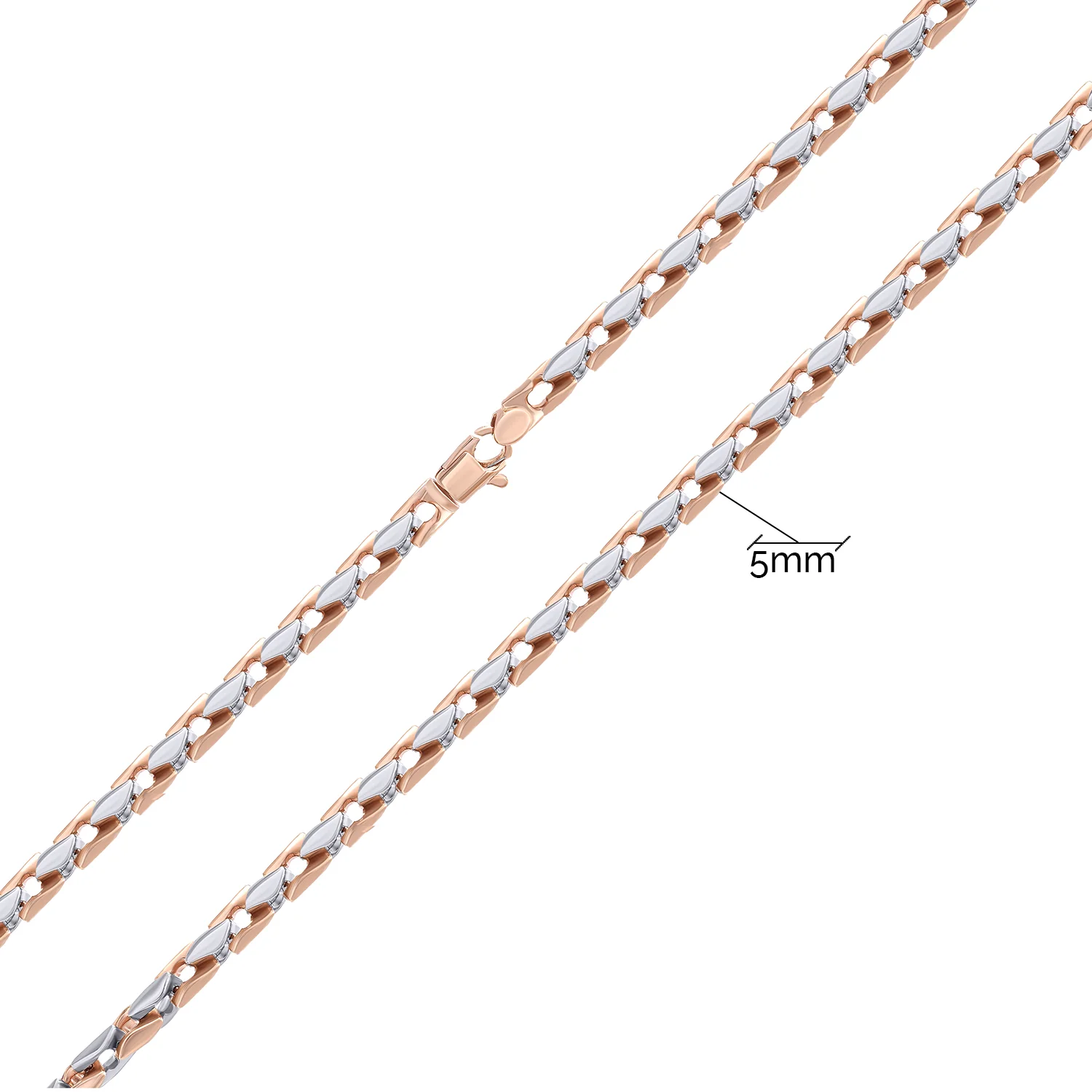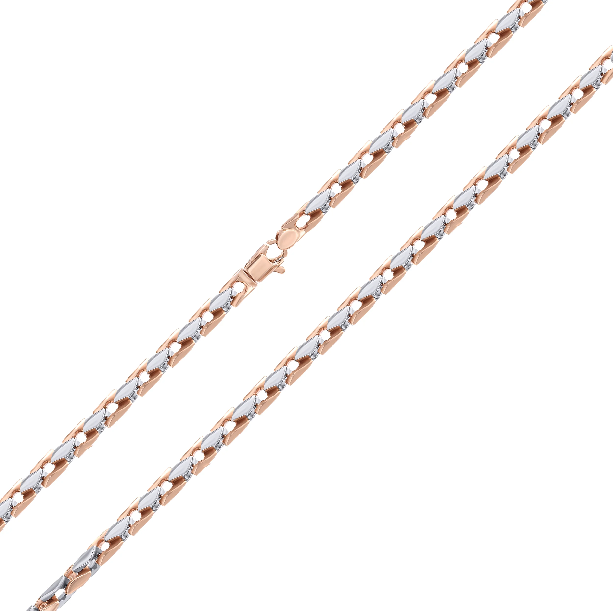 Витонченість білого золота гармонійно комбінується з розкішшю червоного. Ланки мають звивисті лінії, нагадують маленькі листочки, з'єднані краями в масивний ланцюг. Оригінальна, декоративна в'язка не потребує додаткових підвісок, але за бажання можна підібрати класичний хрестик або кулон. Карабін виконаний у червоному золоті, що візуально показує переважання у виробі саме цього кольору. Ланцюжок має шикарний блиск завдяки ідеальній комбінації дорогоцінних металів. Ця прикраса — чудовий вибір для виходу у світ.