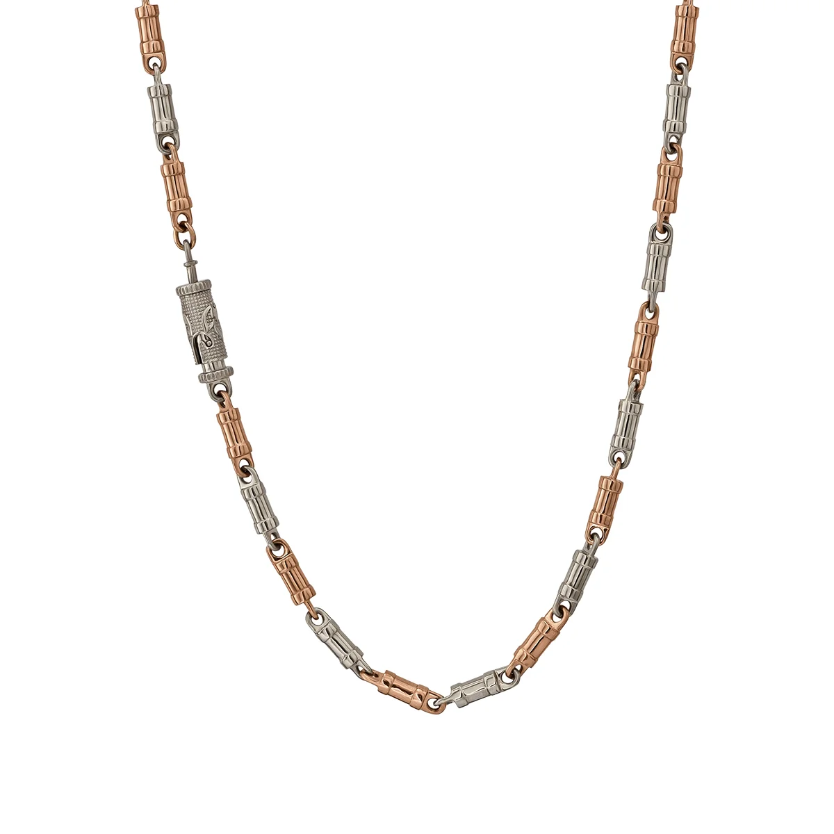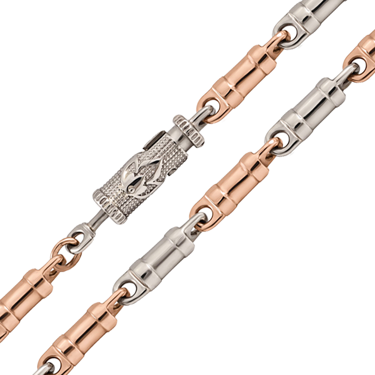 Чоловічий ланцюжок із фантазійним плетінням. Ланки з дизайнерським оформленням з білого і червоного металу. Для виготовлення використовувалися сплави 585 проби. Застібається ланцюжок гвинтовим замком. Одна частина накручується на іншу, він простий у використанні. Прикрасу легко застебнути самостійно, без сторонньої допомоги. Замок з авторським оформленням має естетичний вигляд, практично не виділяється на тлі плетіння. Коштовність у стилі fashion підійде для завершення ділового образу, урочистого, як подарунок до свята.