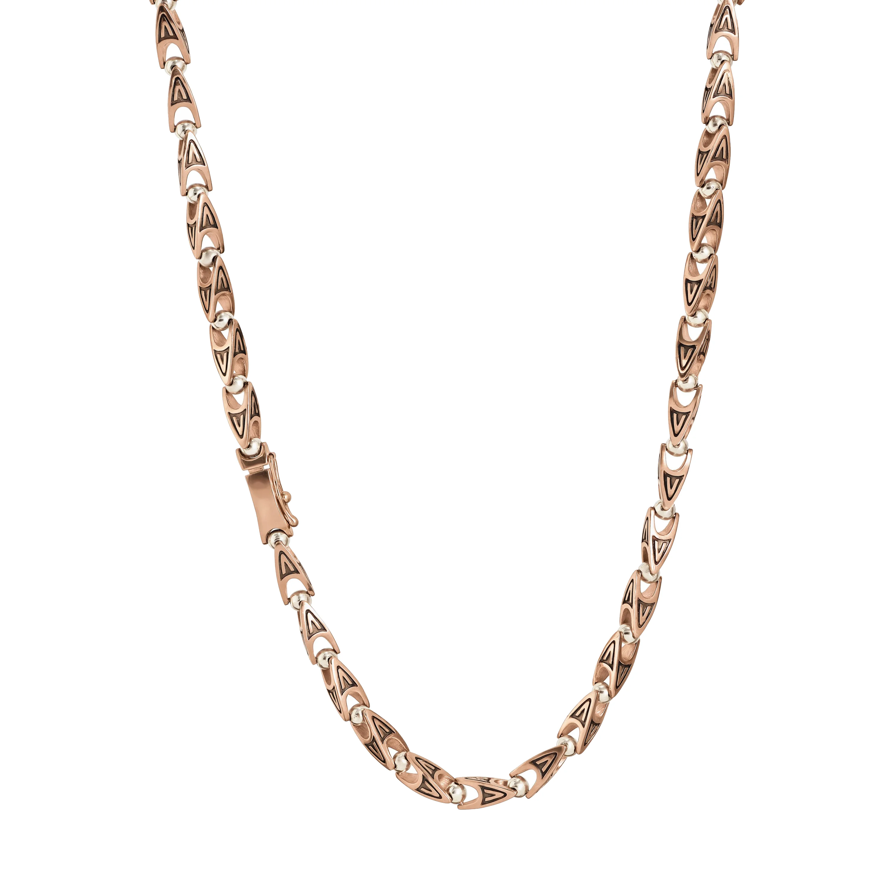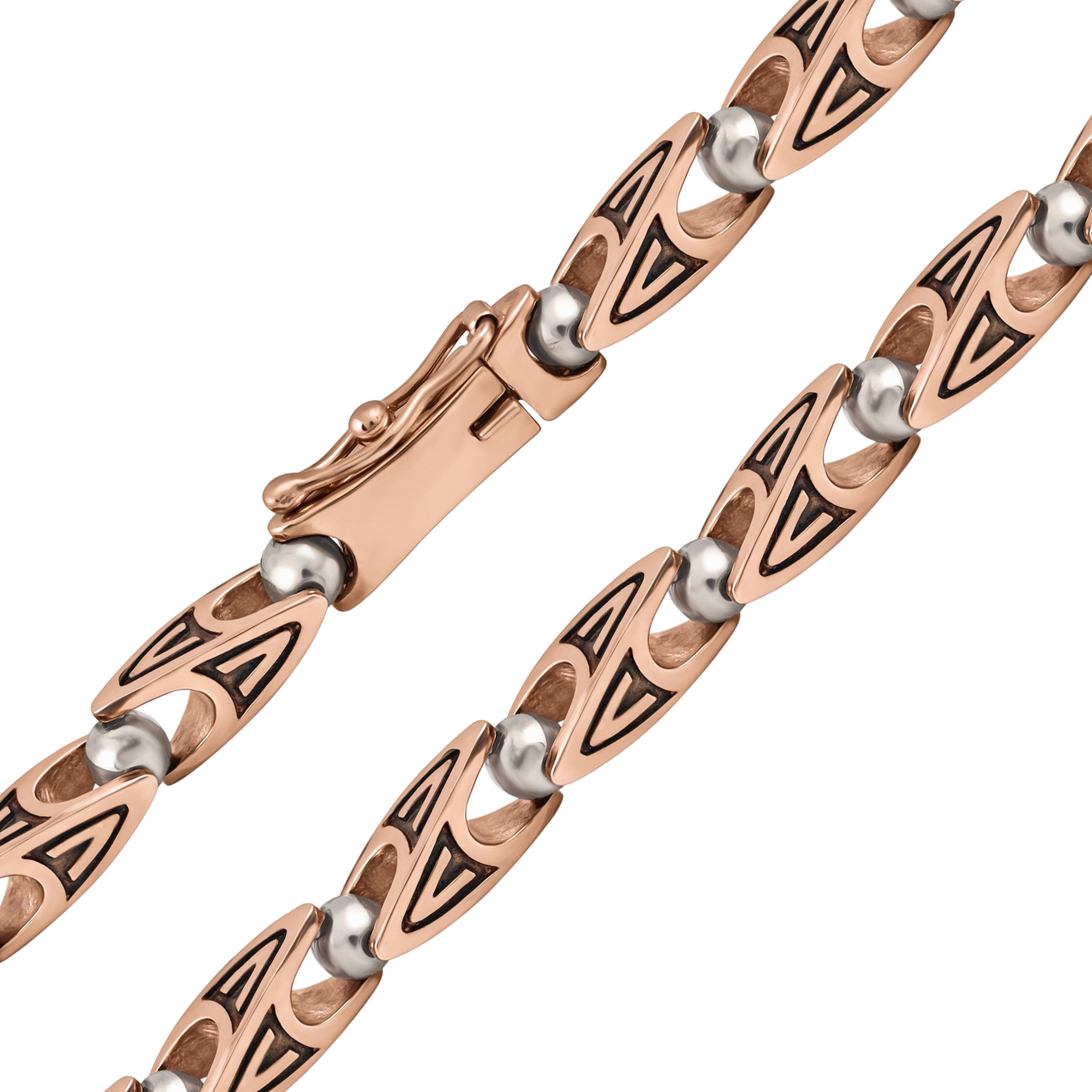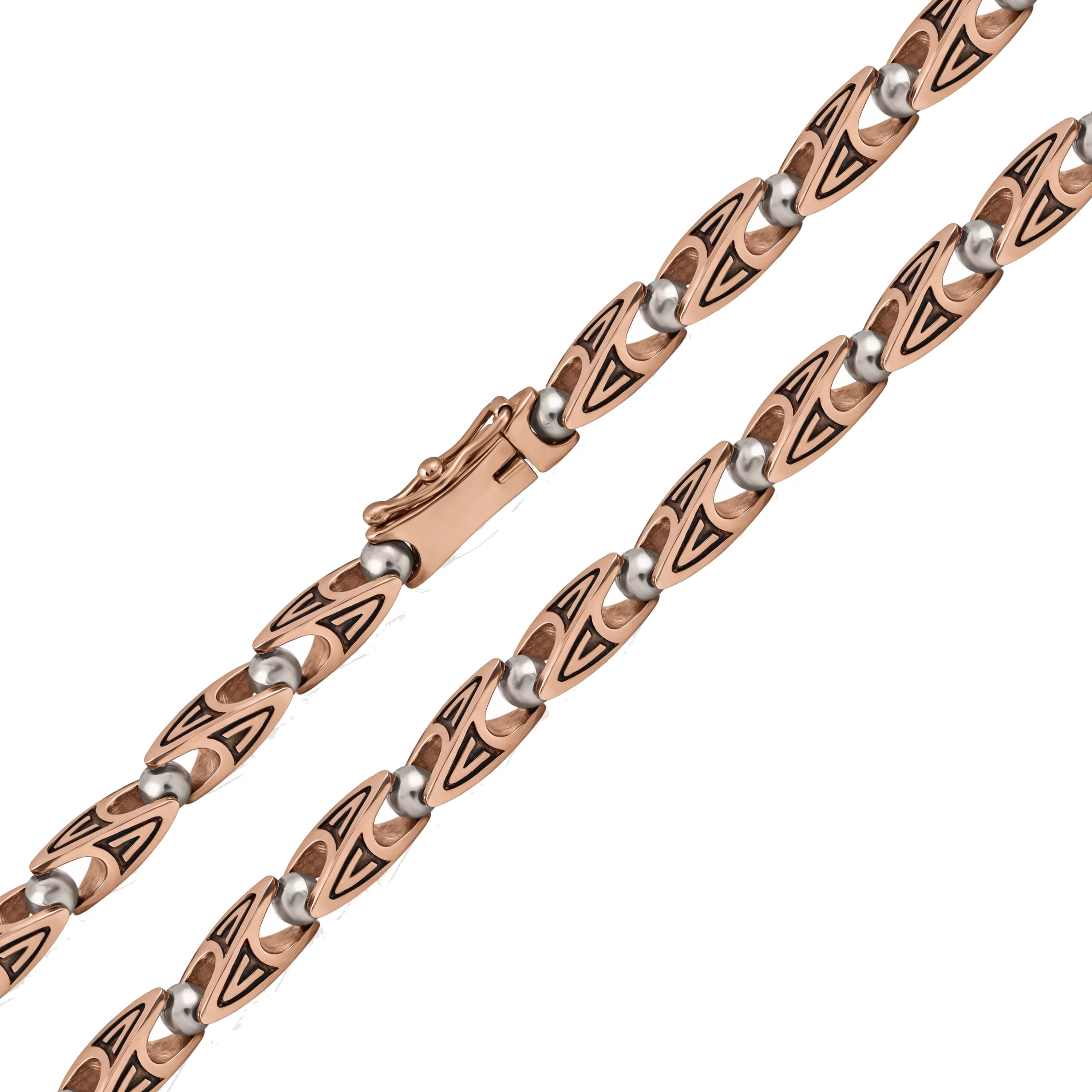 Дизайнерський ланцюг із комбінованого металу 585 проби. Основні ланки червоного відтінку, а сполучні - сріблястого. Прикраса виконана в техніці фантазійне з авторськими рішеннями. Для декору застосовано покриття чорнінням, сріблясті з'єднувачі круглої форми, що візуально нагадують перлини або намистини. Застібається ланцюжок замком-коробочкою з фіксувальними петлями. Він не виділяється на тлі плетіння, витримує великі навантаження. Чоловічий ланцюжок можна доповнити великою підвіскою. Fashion-прикраса підійде як подарунок для близької людини.