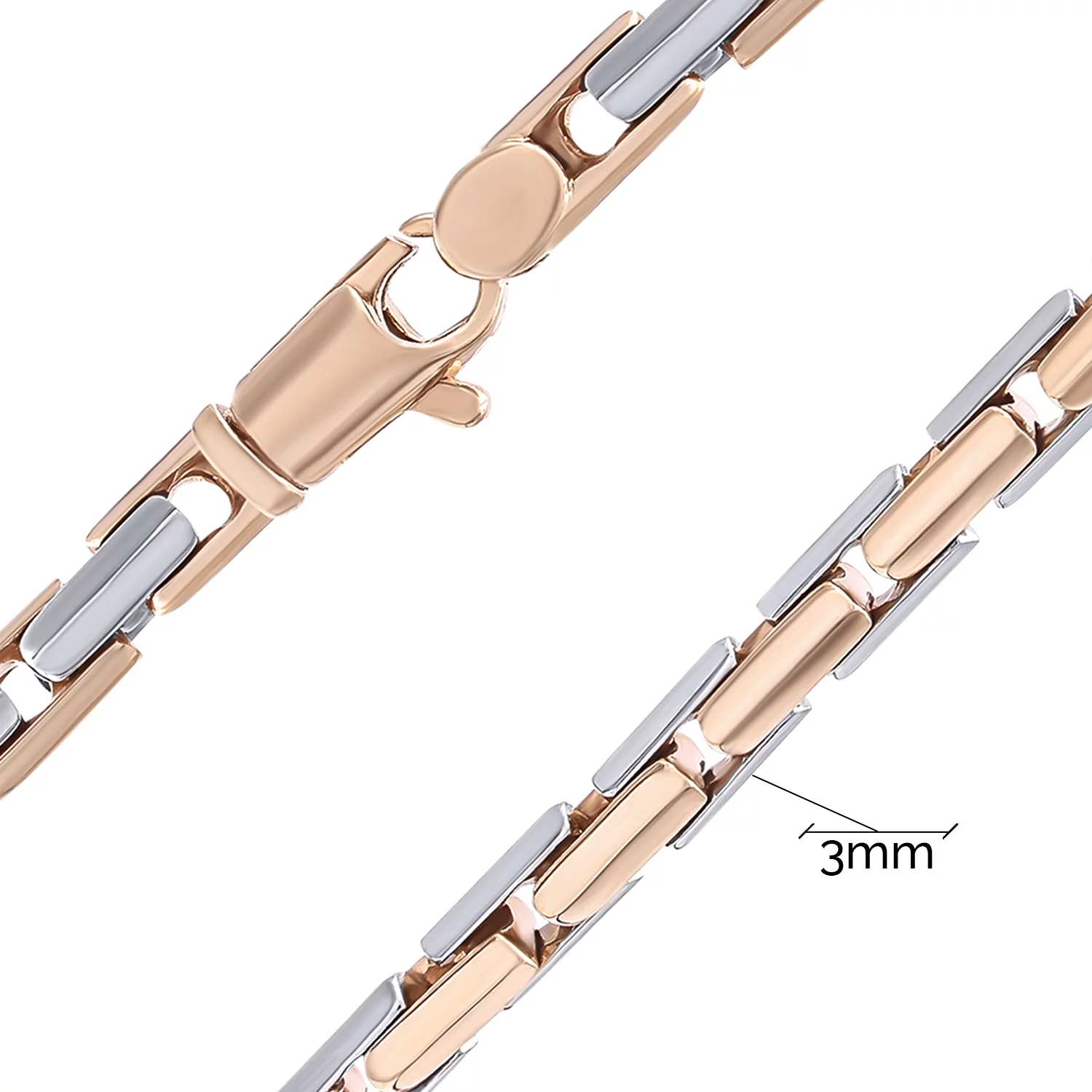 Вироби з комбінованих кольорових металів завжди мають ефектний вигляд. Особливо якщо це стосується білого та червоного золота. Складність технології полягає в різній міцності металів, адже, попри однакову пробу, вони відрізняються складом компонентів, що впливає на міцність частинок. Проте в результаті кропіткої роботи виходить бездоганна, вишукана, оригінальна прикраса. Декоративне плетіння виробу складається з однаково складених ланок і виконано в класичному стилі. Універсальний і водночас розкішний подарунок для справжнього чоловіка.