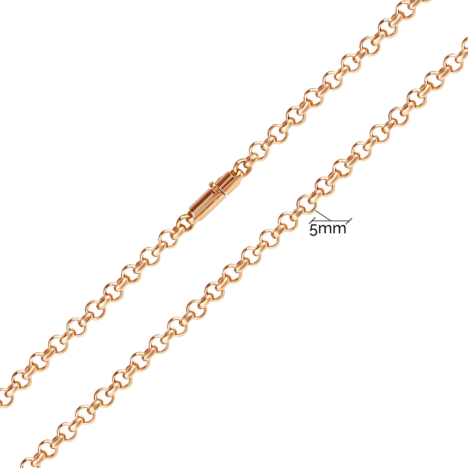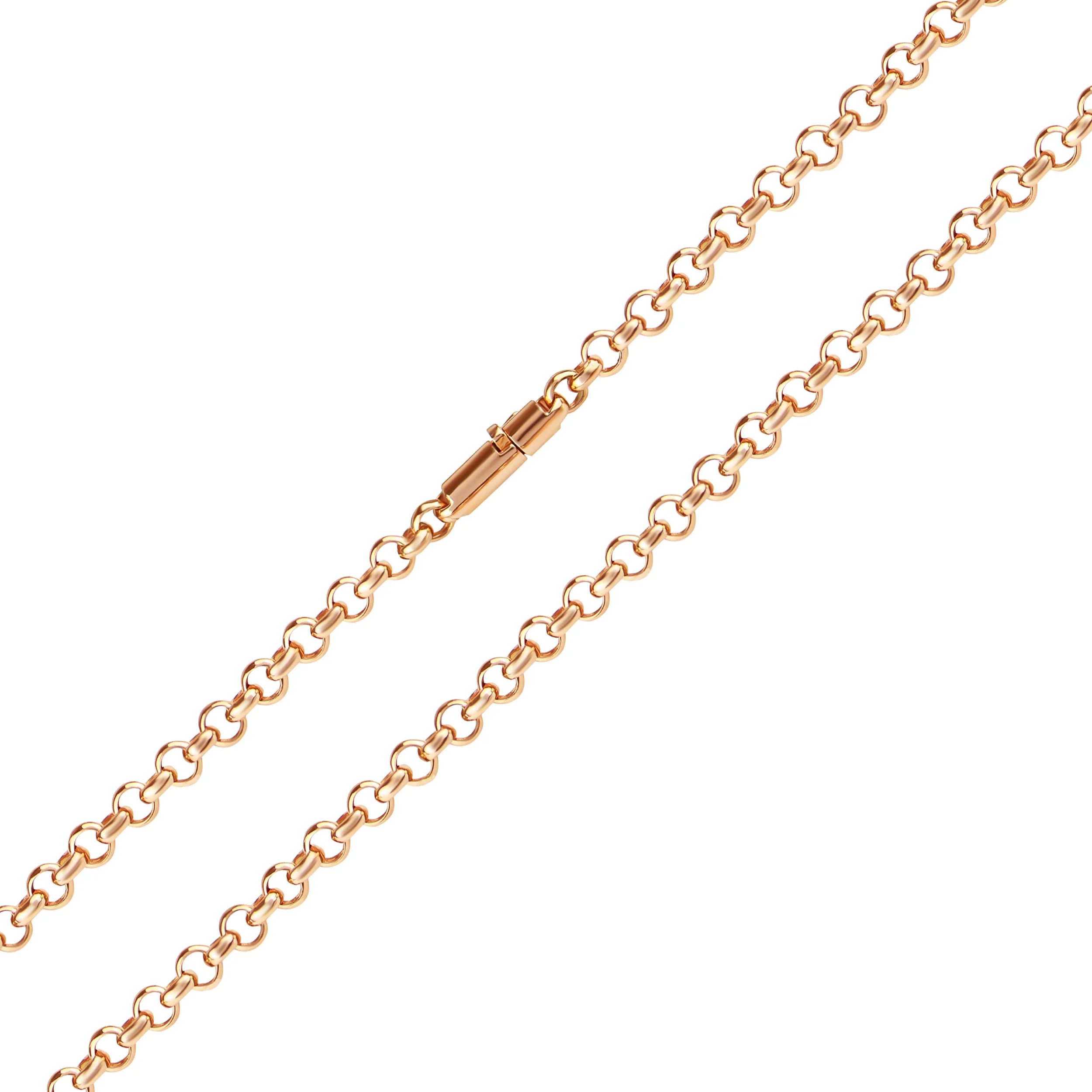 Красивий і важкий ланцюжок з червоного золота послугує стильною прикрасою в чоловічому діловому образі та в жіночому урочистому вбранні з глибоким декольте. Виріб виконано в техніці «ролло» — оригінальний варіант плетіння шопард з однакових круглих ланок, скріплених перпендикулярно одна до одної. Це модель 585 проби з дорогоцінного металу — міцний і довговічний сплав. Виріб не втрачає своїх властивостей роками. Ланцюг виглядає об'ємним, округлим, його краї скріплює замок-коробка закритого типу в заокругленому форматі.
