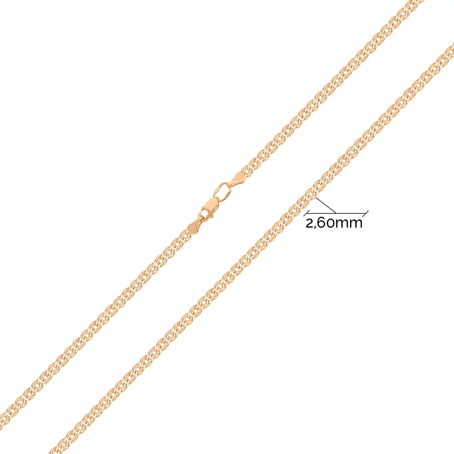 На створення ланцюжка із червоного золота 585 проби надихнула грація та загадкова усмішка великої Мони Лізи. Будь-яка ланка — це неповторний мініатюрний витвір мистецтва, ретельно створений руками майстрів для відтворення таємниці та величі шедевра Ренесансу. Усмішка втілена в кожному згині деталей. Цей різновид скріплення ланок вважається найміцнішим. Прикраса доповнена карабіновою застібкою. Теплий відтінок металу додає виробу яскравого сяйва. Ланцюжок із незвичайним плетінням сподобається шанувальникам класичного стилю.