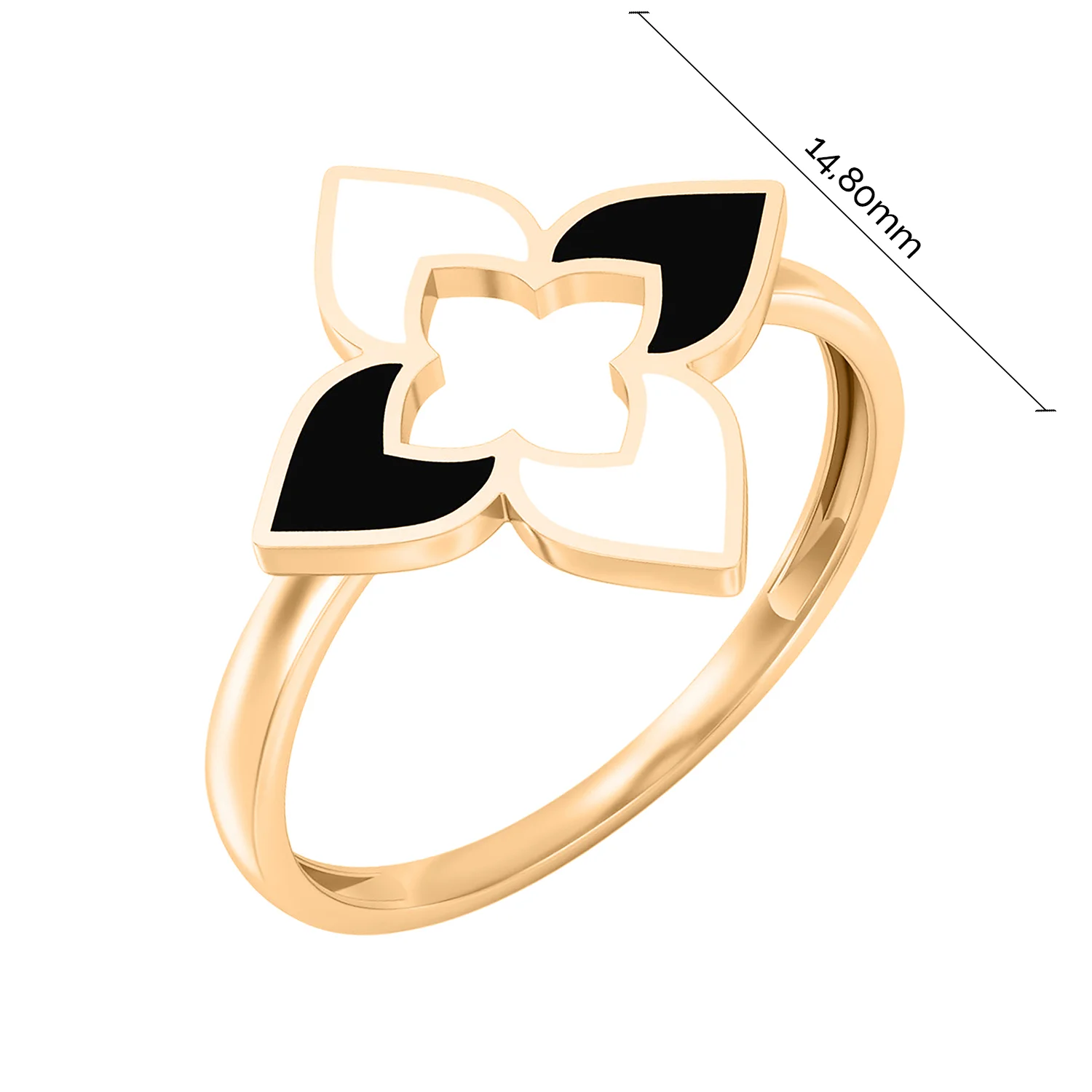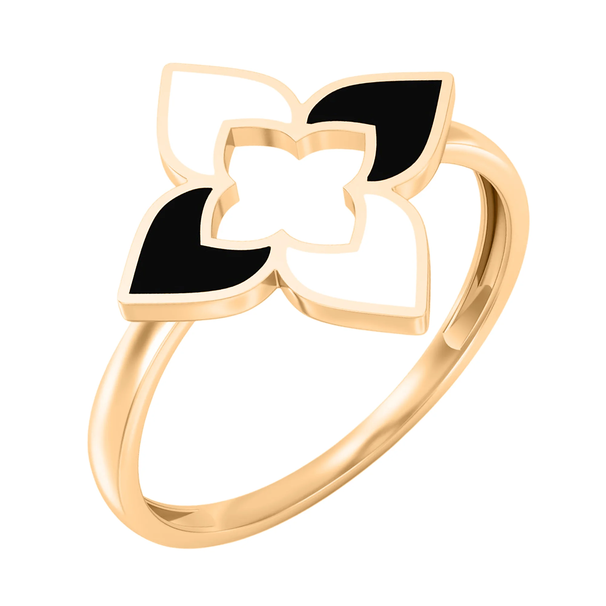 Надзвичайна каблучка червоного золота з емальованою поверхнею. Представлена брендом Роберто Коїн. Складається з пелюсток білого та чорного кольору. Схоже на лілію, що поринула в золоту лавину і генерує природну красу. Подарунок №1 на сезон весна-літо, до Дня народження, на ювілей чи будь-яке інше свято.