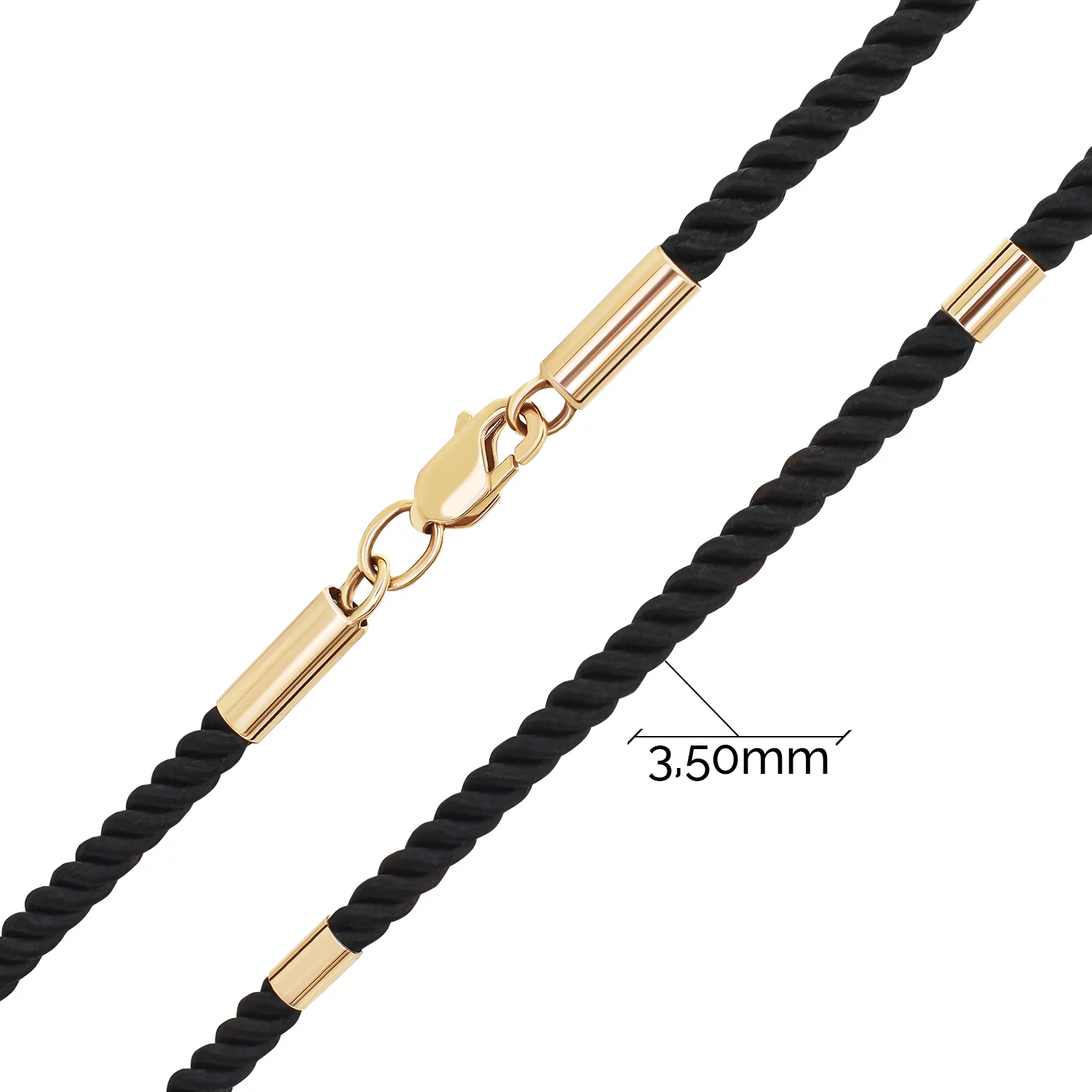 Ювелірний шнурок належить до категорії прикрас унісекс. Універсальність пояснюється класичним поєднанням кольорів. Об'ємний чорний шнур виконаний із шовкових волокон — міцних та стійких до розтягування. Матеріал легкий і тактильно приємний. Виріб декорований вставками й замком із червоного золота 585 проби. Тип застібки — карабін, що забезпечує надійну фіксацію двох кінців шнура. Стиль прикраси — класичний. Його можна поєднувати з повсякденним чи урочисто ошатним стилем. Ювелірний шнурок — вишуканий подарунок чоловікові чи жінці на будь-яке свято.