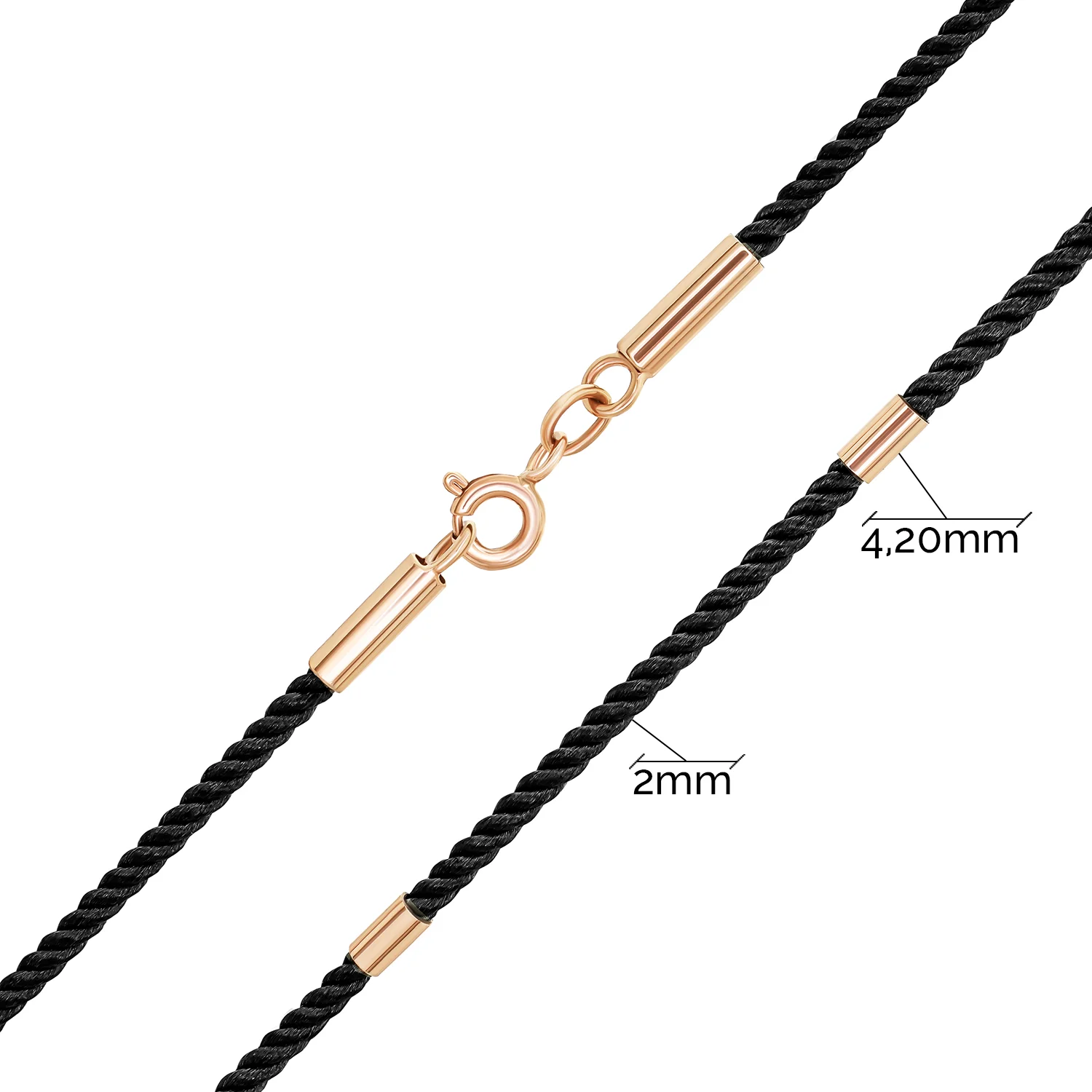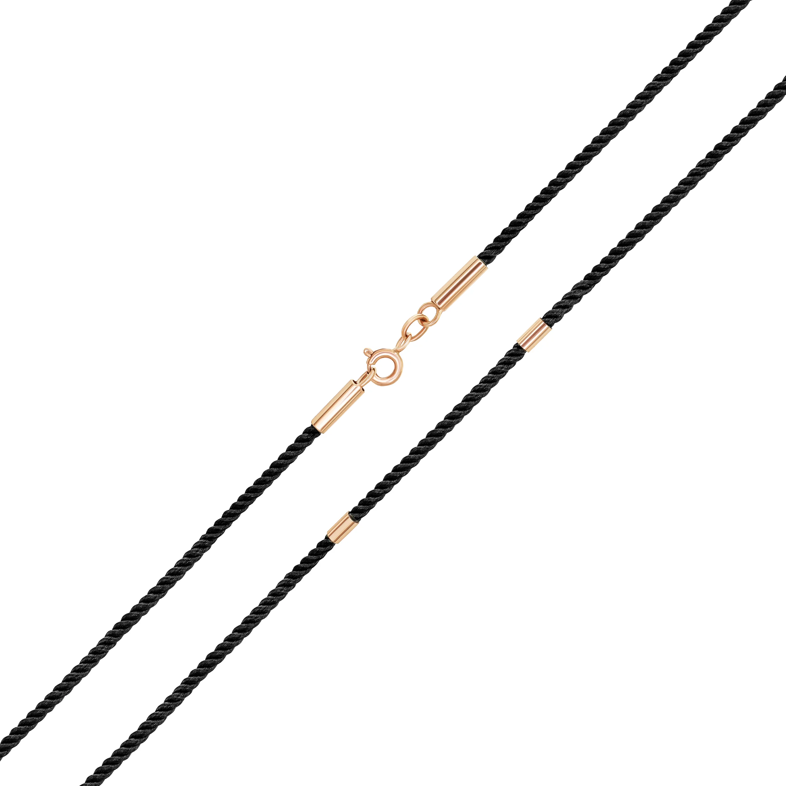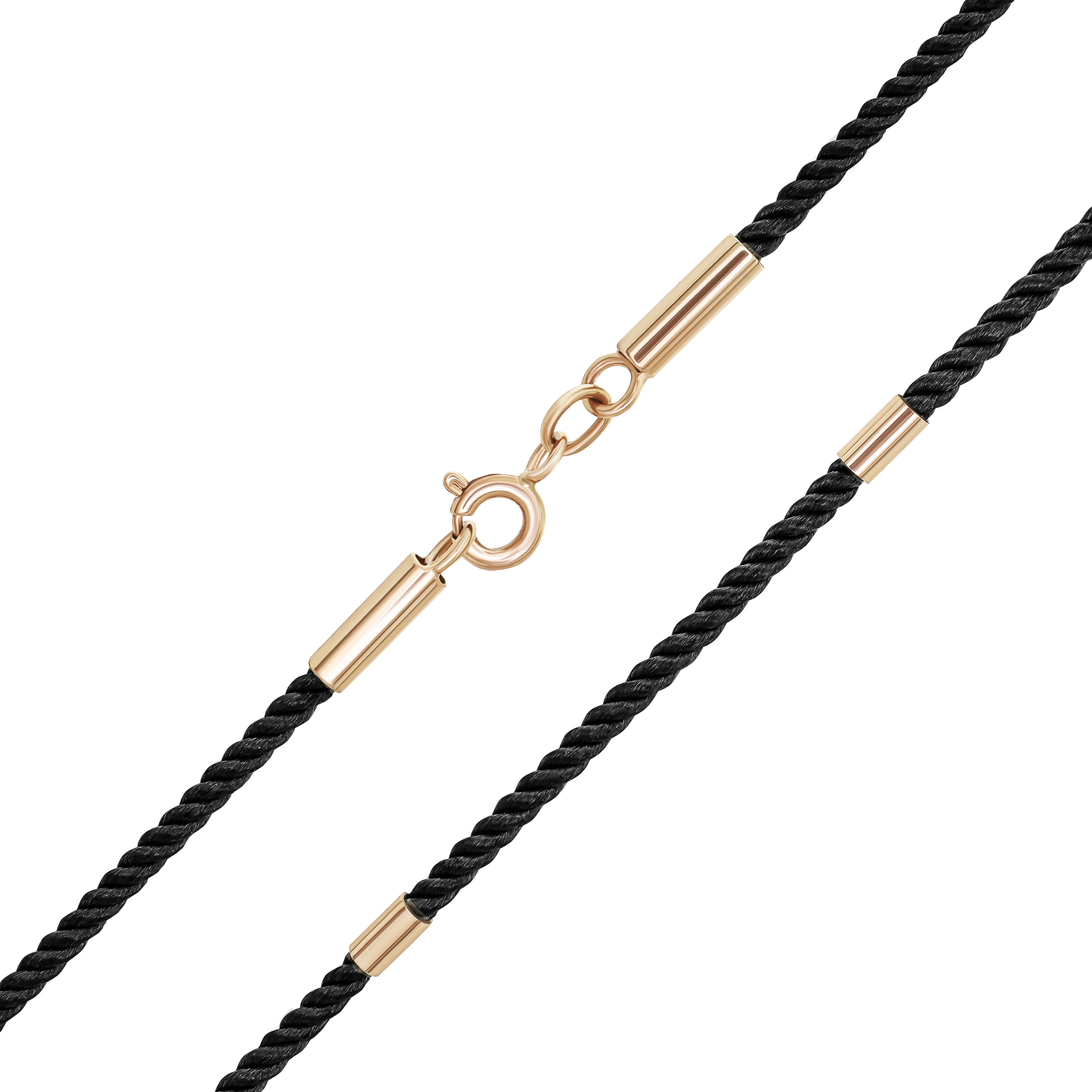 Ювелірний шнурок із шовку із золотим замком — елегантна та практична прикраса, гарна альтернатива ланцюжку. Він ідеально підходить людям, які не сприймають важкі вироби. Шовковиста вощена структура чорного кольору створює приємне відчуття легкості на шкірі та особливу розкіш. На шнурку — дві золоті вставки із червоного благородного металу 585 проби. Застібка забезпечує надійне та легке закріплення прикраси. Її можна носити повсякденно чи надягати на урочисті заходи, поєднуючи з іншими золотими виробами.