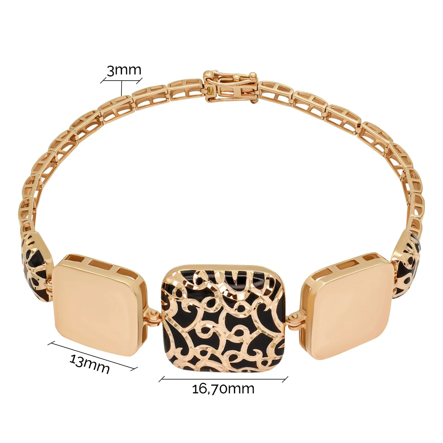 Жорсткий браслет із червоного золота з емаллю з першого погляду вражає розкішним дизайном. Центральними елементами ювелірної композиції є три квадрати різних розмірів із двома колами з боків. Цілком золоті фігури чергуються з покритими емаллю. Гладкий чорний матеріал із цікавими візерунками створює контраст у дизайні браслета. Для надійної фіксації на зап'ясті передбачений замочок у вигляді пряжки. Його зручно застібати самостійно без сторонньої допомоги. Браслет стане яскравим акцентом у повсякденному чи вечірньому образі в поєднанні з іншими прикрасами.