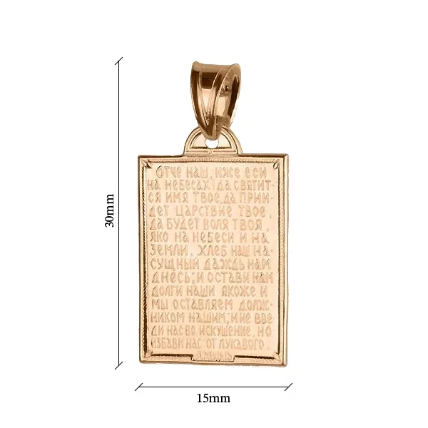 Золота ладанка Отче наш – ідеальний вибір для тих, хто шукає надійний оберіг і ставить сакральність на перше місце. Зайві дизайнерські деталі не перевантажують виріб, а основний акцент саме в повному тексті головної молитви вірян. При цьому через таку лаконічність не страждає естетична привабливість виробу. Гра відтінків обідка, фону і тексту молитви створює потрібні акценти і визначає задумку оформлення. Приємна тепла палітра червоного золота милує око, а чітка геометрія форми ладанки врівноважується округлими лініями вушка і перемички до неї.