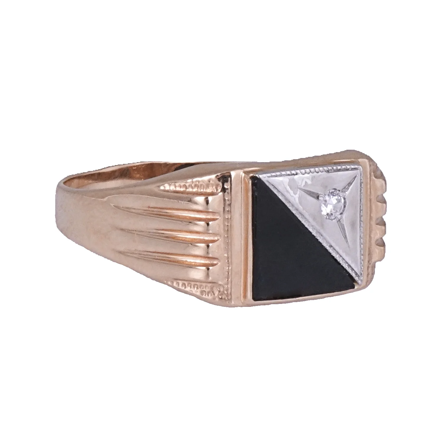Перстень-печатка з червоного золота з емаллю і доріжками з чорних фіанітів - 1874654