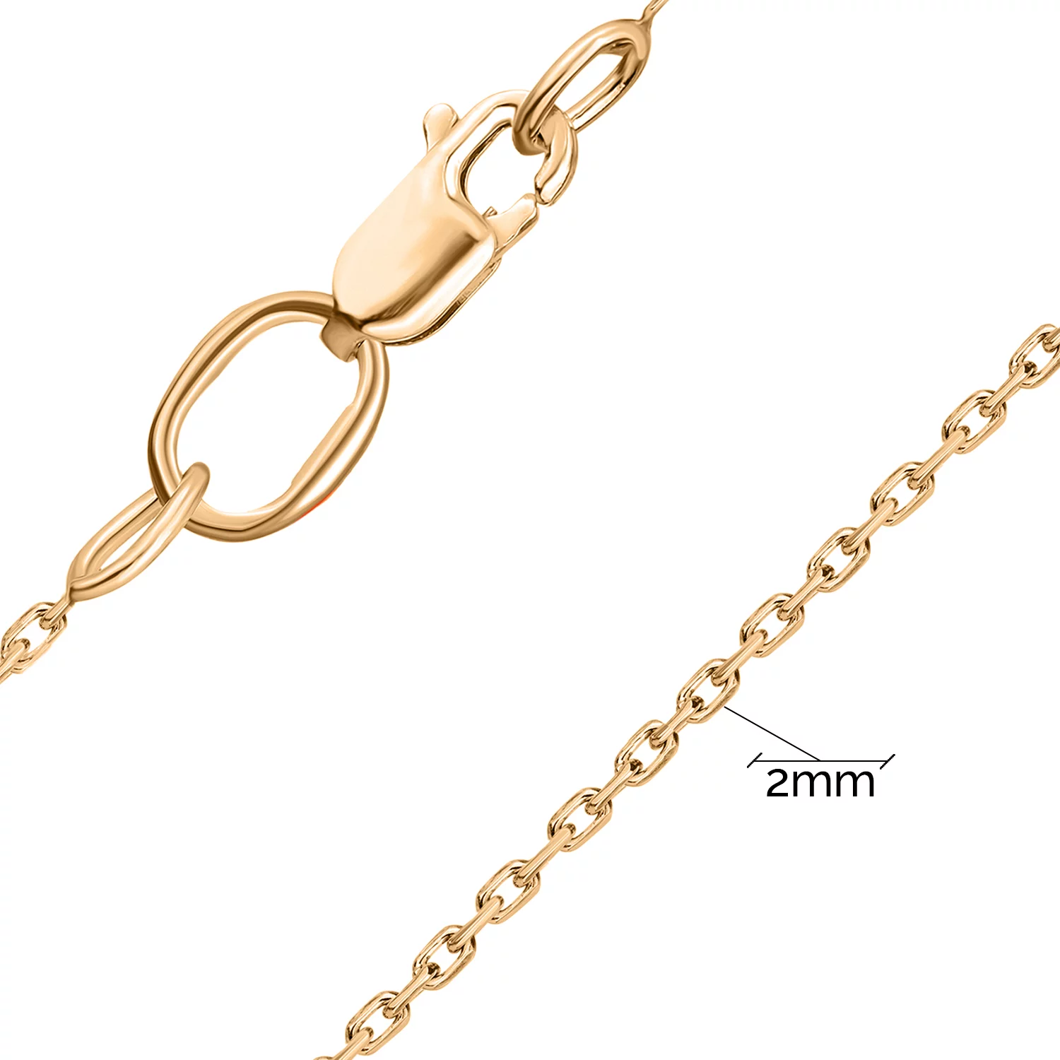Сучасна класика — універсальний золотий ланцюжок із червоного золота. Прикраса 585 проби з теплим відтінком, що виходить завдяки додаванню до сплаву міді. Класичне якірне плетіння складається з овальних ланок, перпендикулярно поєднаних між собою. Така технологія відрізняється стійкістю до пошкоджень. Краї ланцюжка з'єднує міцний та надійний замок карабін. Прикраса не потребує додаткових аксесуарів у вигляді кулонів, оскільки великі ланки виглядають самодостатньо та голосно. Такий ланцюжок стане яскравим доповненням до будь-якого образу.
