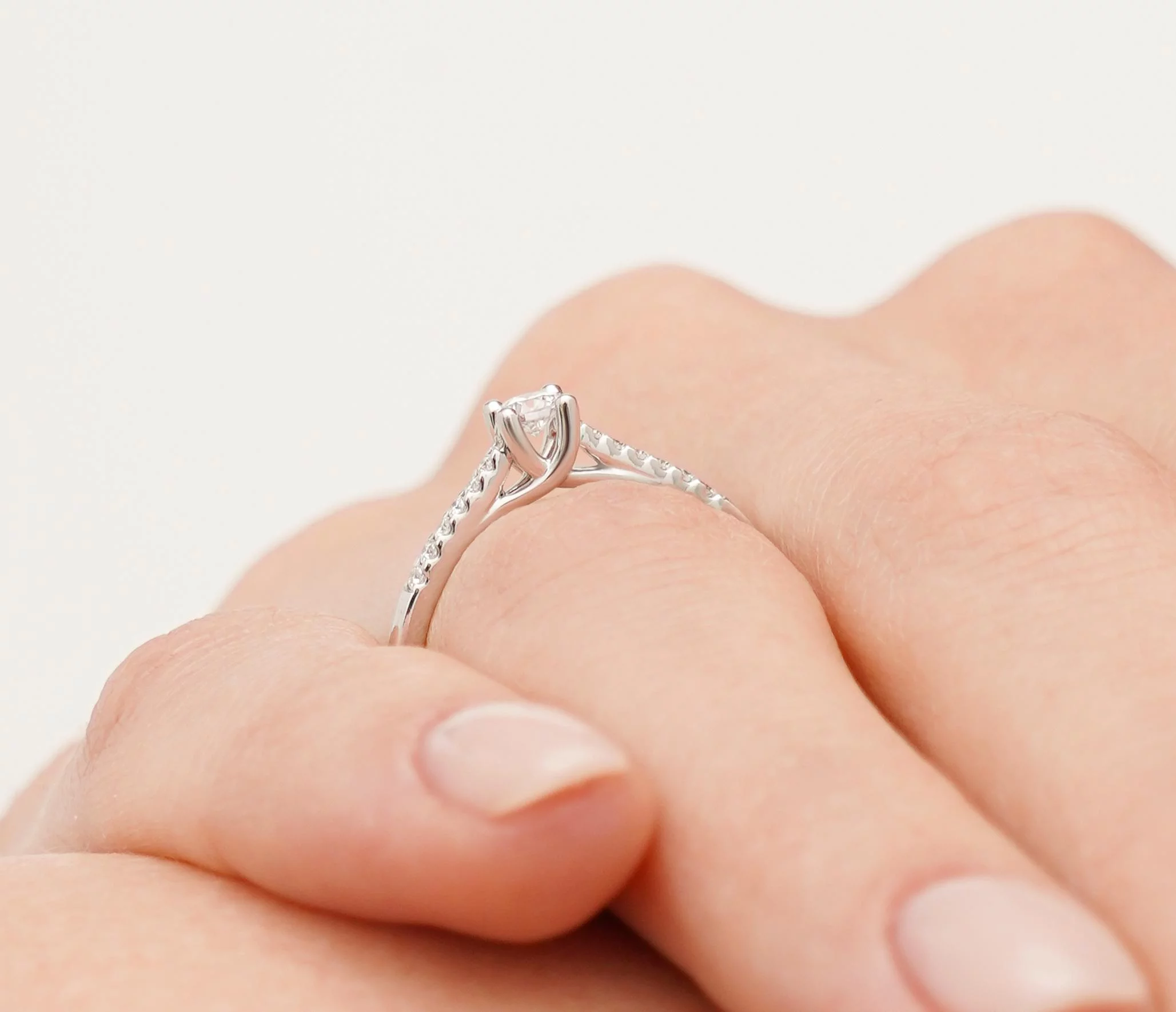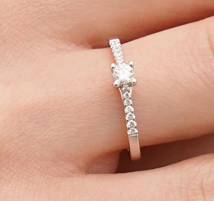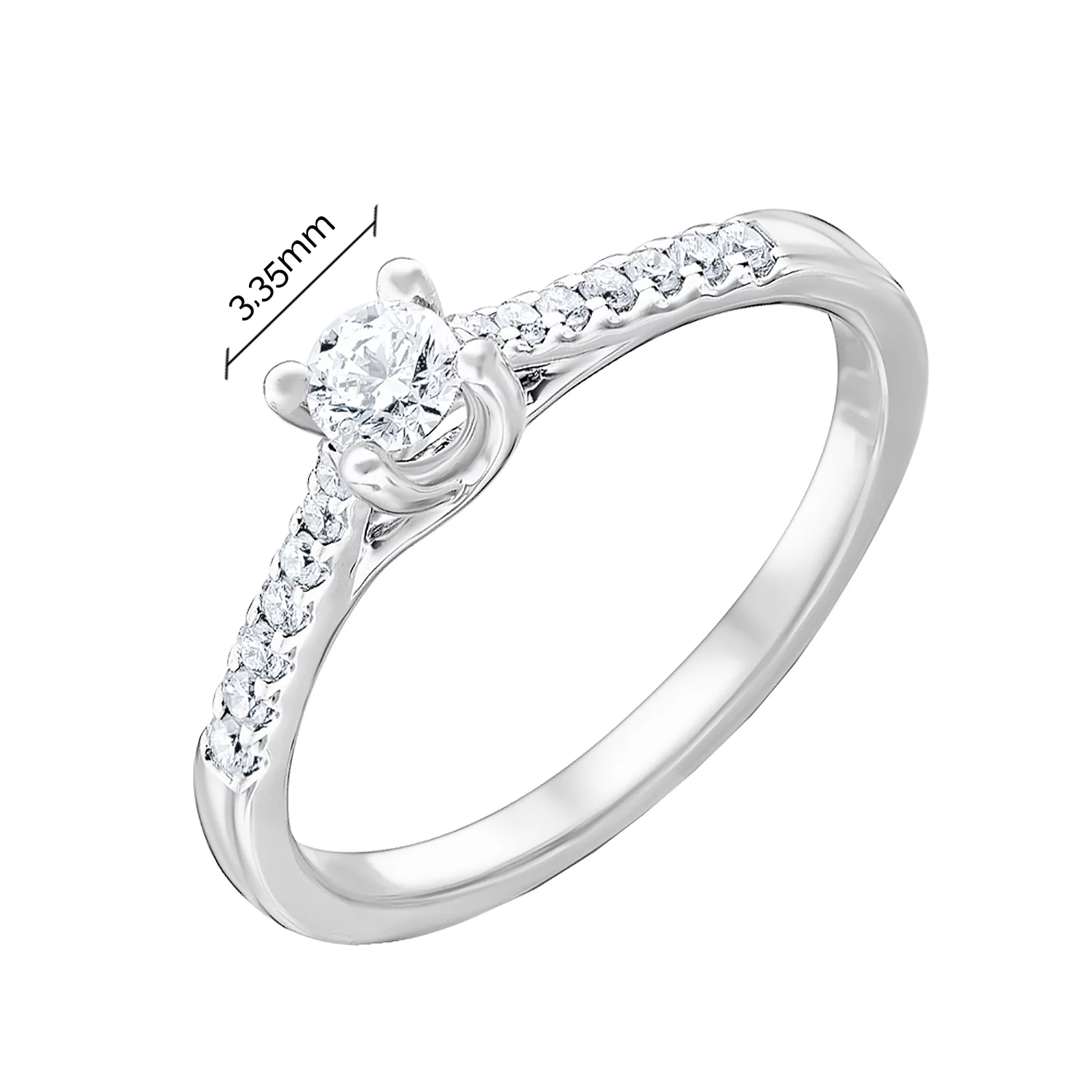 Акуратна, ніжна каблучка з білого золота. Для виготовлення використовувався сплав 585 проби, легований паладієм для надання красивого холодного відтінку. У прикрасі погляд притягують камені: центральний більший і 14 менших із боків. Діаманти круглого ограновування, що дозволяє їм красиво сяяти в променях світла. Великий надійно закріплений крапановим методом між двома дугами, які піднімають його над основою. З боків відходить накладка, відокремлена від шинки просвітом, щоби підкреслити витонченість виробу. Дрібні самоцвіти міцно посаджені в метал корнеровим способом.