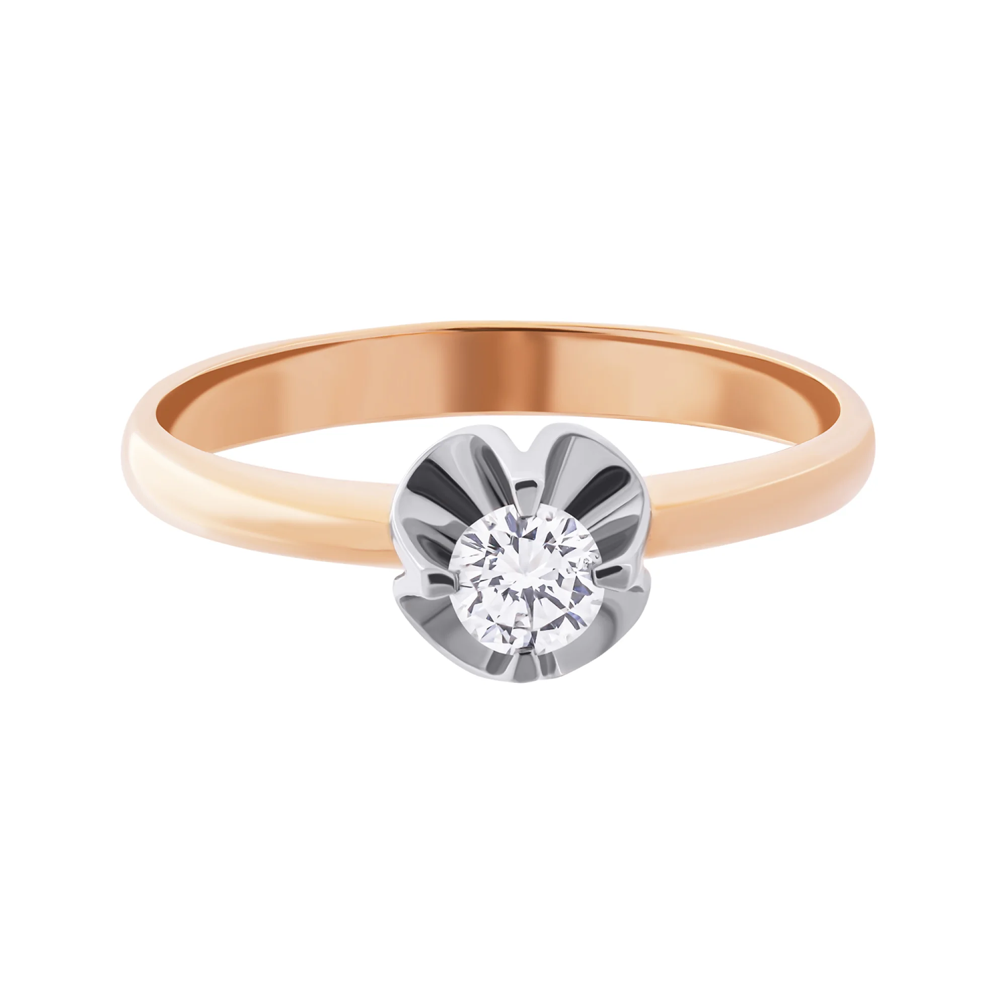 Класика, яка завжди буде доречною та не втратить актуальності. Тонка витончена каблучка виготовлена із золота 585 проби двох відтінків. Основна частина має теплий червоний тон, а контрастний білий метал формує філігранну деталь у вигляді мініатюрної квітки, увінчаної діамантом. Окраса гармонійно поєднується з іншими золотими виробами. Підберіть сережки в аналогічному дизайні для ідеальної комбінації. Каблучка стане пам'ятним подарунком доньці, близькій подрузі та коханій жінці, у тому числі для пропозиції руки та серця.