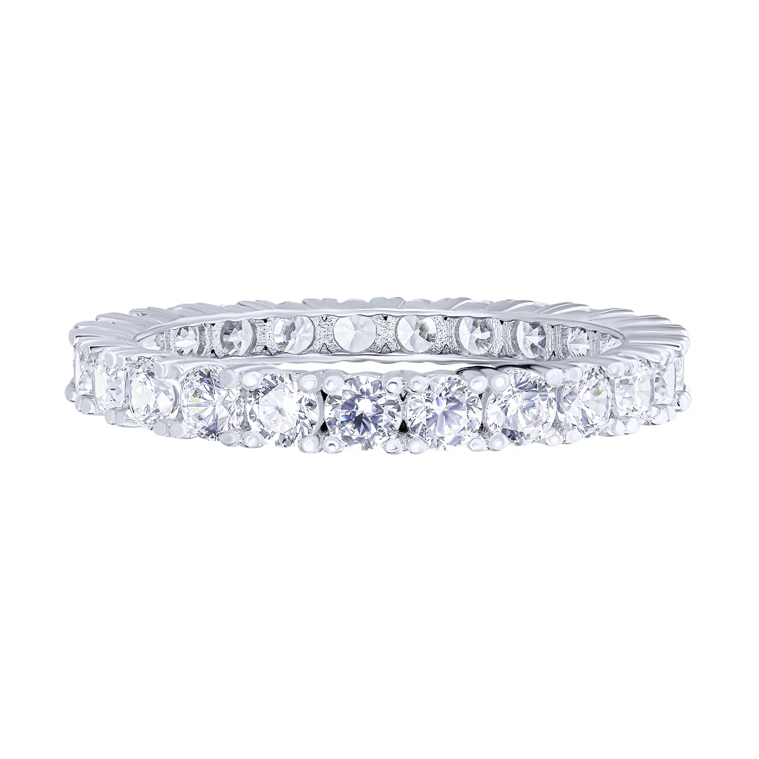 Золота каблучка з доріжкою фіанітів — елегантна й розкішна прикраса, яку можуть носити як юні дівчата, так і зрілі дами. Виконано виріб із дорогоцінного металу 585 проби. Білий колір надає золоту паладій, доданий у лігатуру сплаву в кількості 9,5%. Перстень прикрашений фіанітами круглого огранювання. Прозорість каменів у комбінації з білим дорогоцінним металом посилює сяйво та надає ювелірному виробу розкоші. Каблучка виконана в універсальному стилі, тому гармонійно поєднується з будь-якими образами та вбраннями та стане шикарним подарунком до свята або просто так.