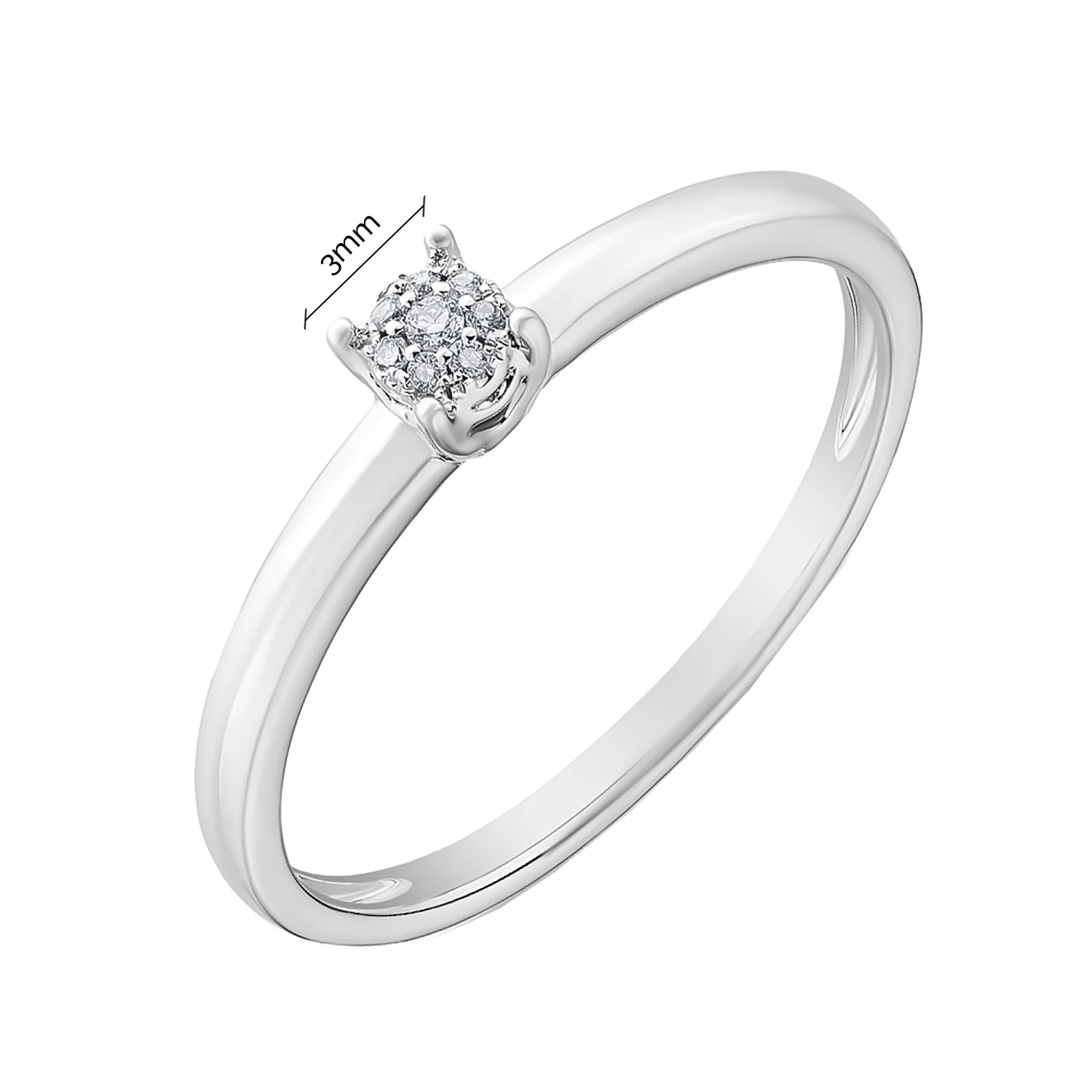 Золота каблучка з розсипом діамантів — вишуканий варіант заручальної прикраси, що підкреслює серйозність намірів чоловіка. Виріб створений у класичному стилі, тому його можна носити як сольно, так і доповнити ним раніше зібраний ювелірний ансамбль. Каблучку виготовили з білого золота 585 проби. Блискучий колір дорогоцінному металу надає паладій, доданий до лігатури сплаву (9,5%). Виріб прикрашений діамантами з круглим огранюванням, сконцентрованими в центральній верхній частині обідка. Відбиваючи світло, камені створюють чарівний блискучий ефект.