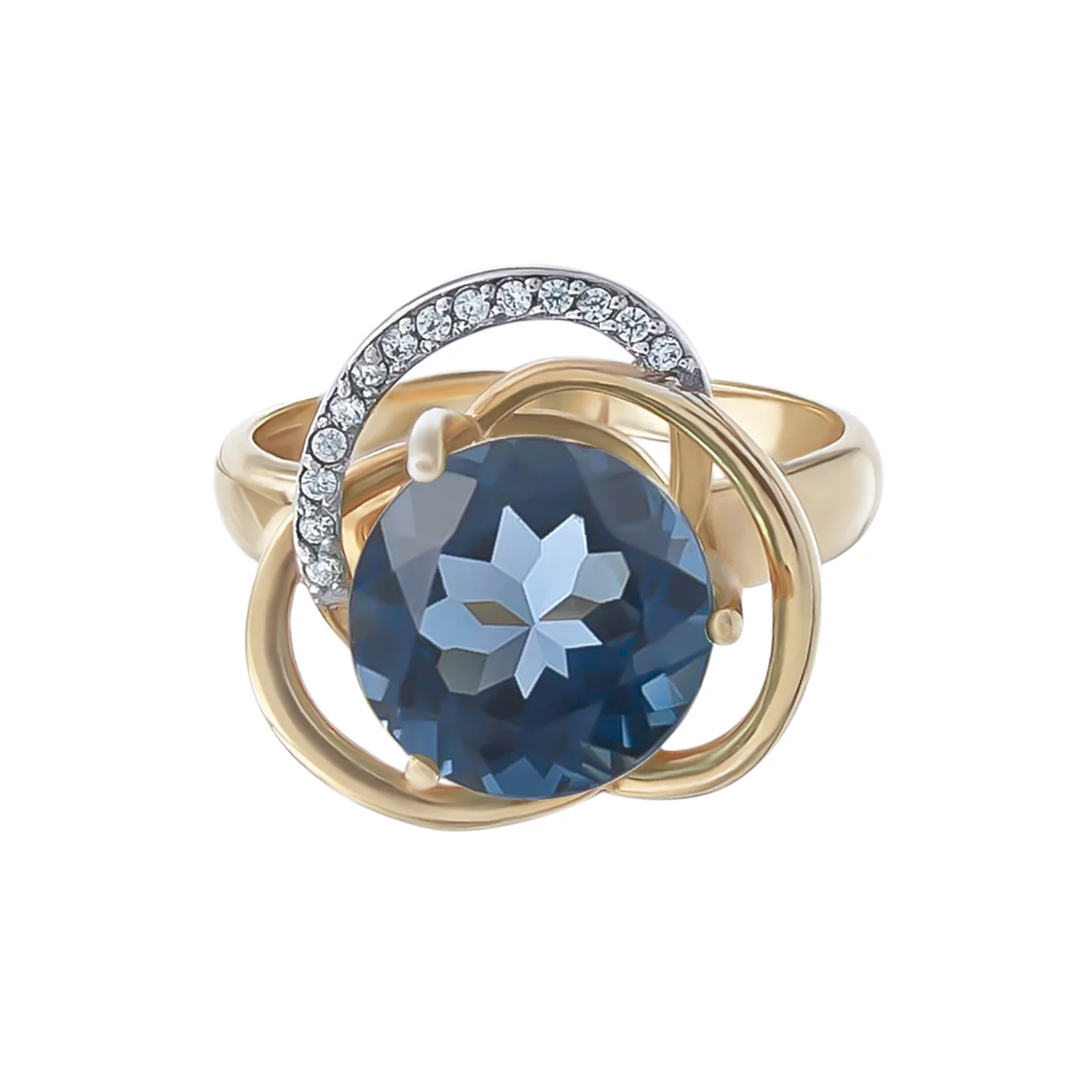 Стильна каблучка у геометричному стилі в червоному золоті з топазом та фіанітами - 1939740