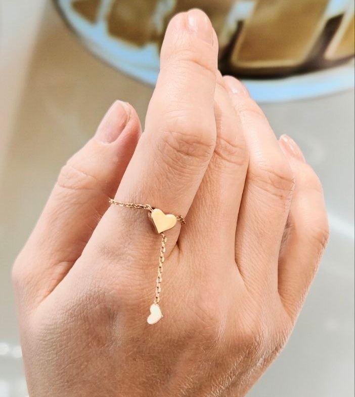 Витонченість та жіночність поєднує в собі м'яке кільце-ланцюжок «Серце» в червоному золоті з підвісом. Це регульована прикраса в романтичному стилі, яка має ніжний вигляд на руці та надає пальцям витонченості. Виконано виріб із традиційного дорогоцінного металу 585 проби, а завдяки міді, доданої в лігатуру сплаву, золото має червонуватий відтінок. Кільце складається з тонкого ланцюжка та двох сердець — об'ємного та плоского. Таку прикрасу можна носити як із легкими романтичними сукнями, так і з вечірнім вбранням.