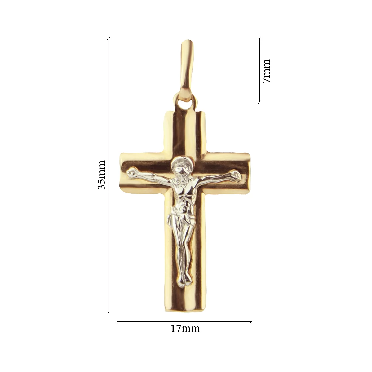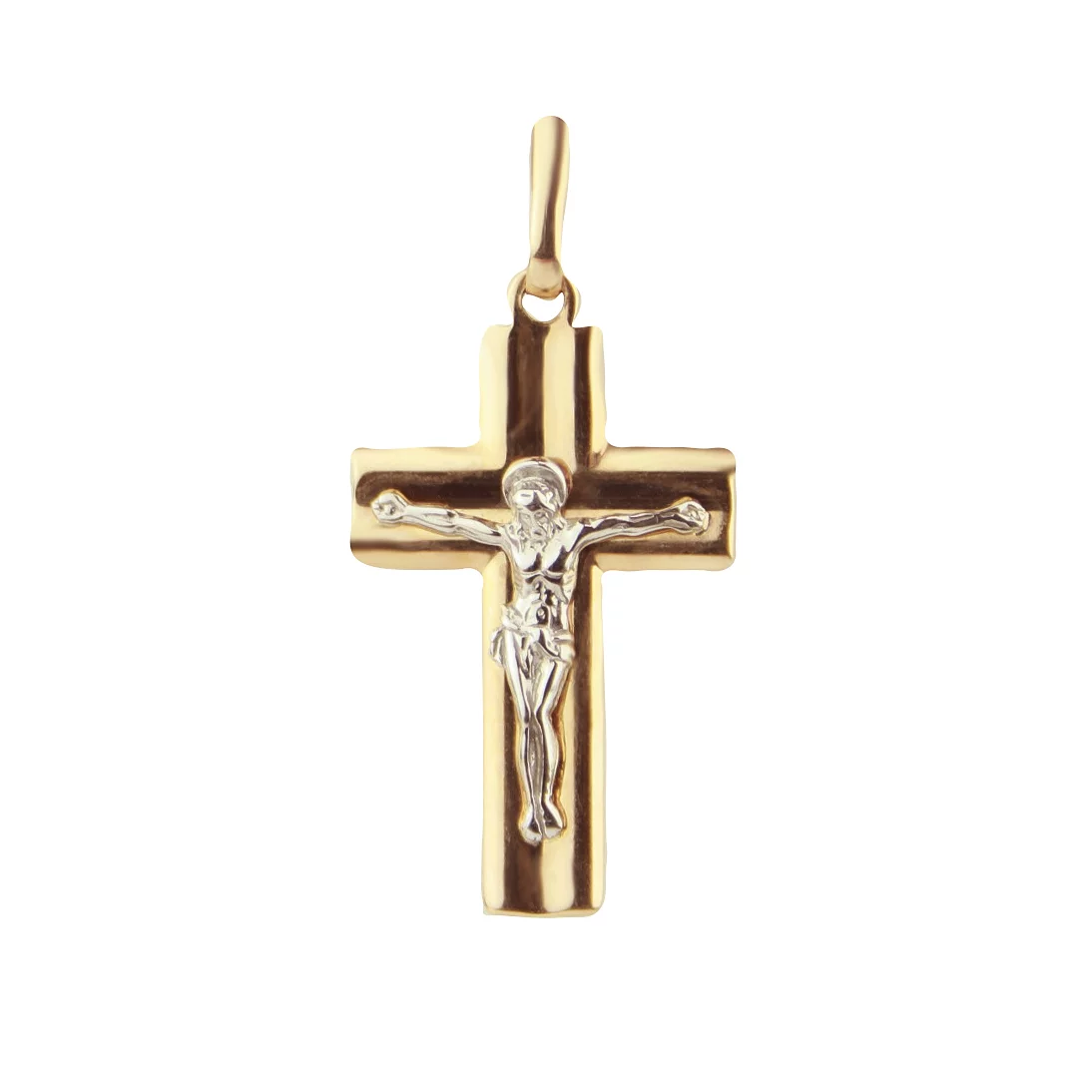 Стильний хрестик із комбінованого золота пасуватиме чоловікам, дітям і жінкам. Ювелірний виріб унісекс виготовлено з металів 585 проби. Відсоток вмісту золота в них – 58,5, решта припадає на лігатурні елементи. Грані хрестика увігнуті всередину, це візуально надає йому об'єму. Коштовність виконана в класичному стилі з нотками мінімалізму. Церковна підвіска органічно поєднується зі стриманими ланцюжками. Можна підібрати з якірним плетінням. Це чудовий варіант подарунка для дорогої людини до важливої події, наприклад, до дня народження.