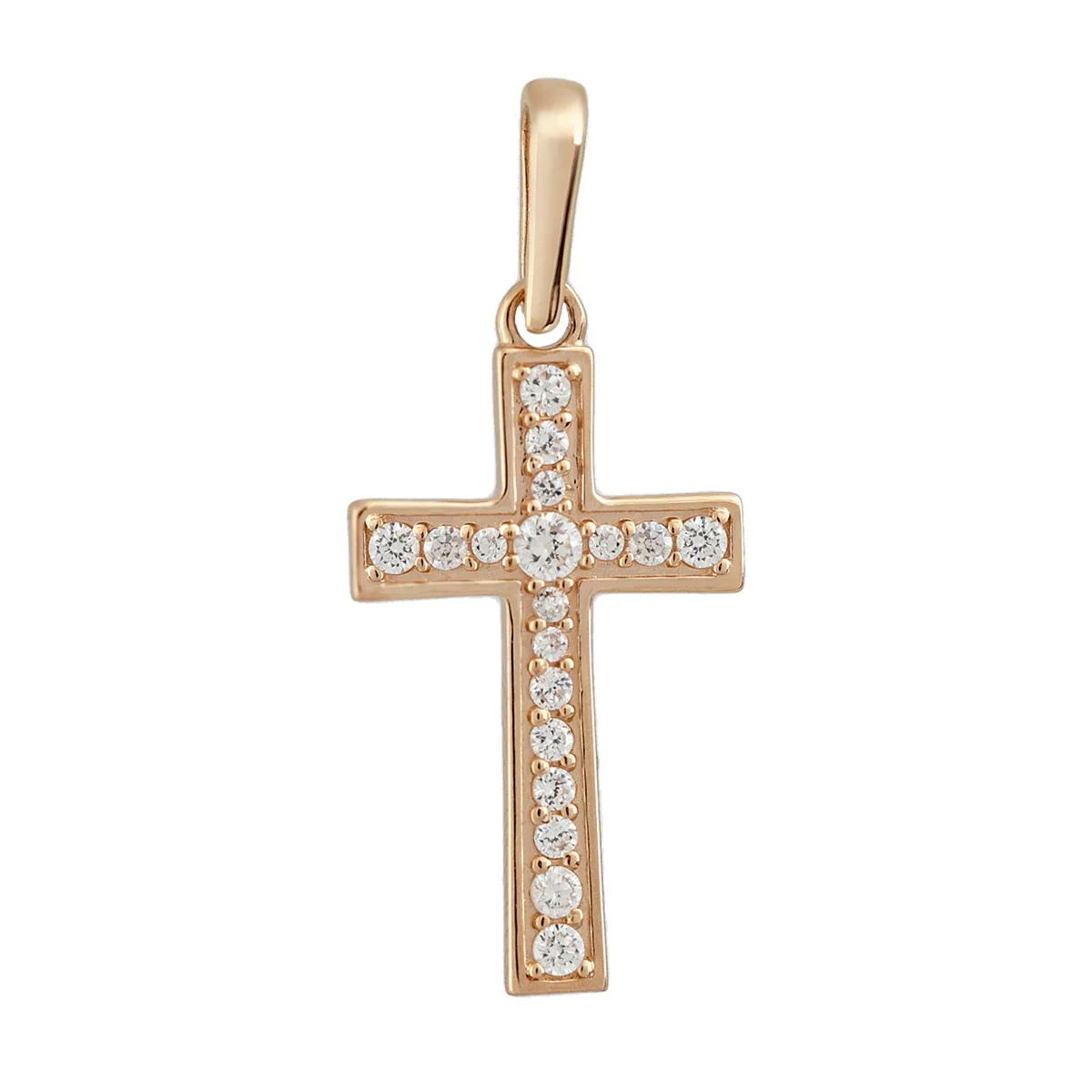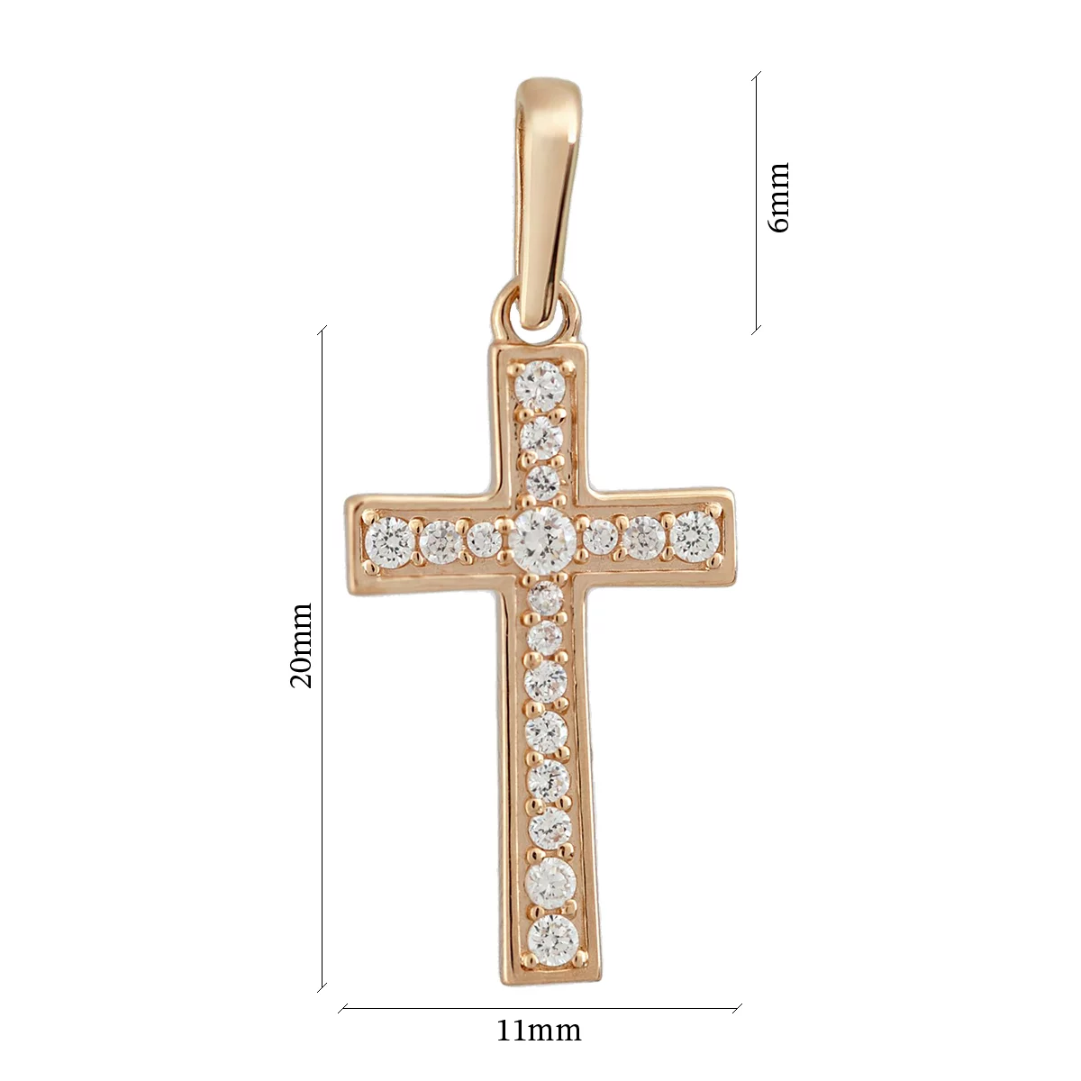 Поєднання червоного золота з блиском дорогоцінного каміння — вічне і завжди актуальне. Приємний теплий відтінок металу гармонійно переливається з мерехтінням цирконію. Розсип каменів естетично оформлюється обрамленням, а градація розміру цирконію створює цікаву оптичну ілюзію. Дрібні вкраплення червоного золота між камінням у чіткій геометрії надають дизайну родзинки, але не перенасичують композицію. Оформлення хрестика досить універсальне для можливості доповнити прикрасою святковий образ і носити як оберіг на кожен день.