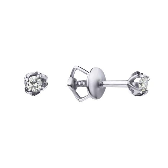 Сережки з діамантами — витончена та стильна ювелірна прикраса. Зроблені з білого золота 585 проби. Дорогоцінний камінь круглого огранювання фіксується чотирма лапками. Діамант блищить, переливається та сяє на сонці. Застібаються сережки класичного стилю на гвинтовий замок. Механізм дає змогу самостійно регулювати рівень притискання застібки до вуха. Він надійний та безпечний у щоденному носінні. Сережки з білого золота з діамантами прикрасять ваш повсякденний, елегантний образ або стануть стильним доповненням свята.