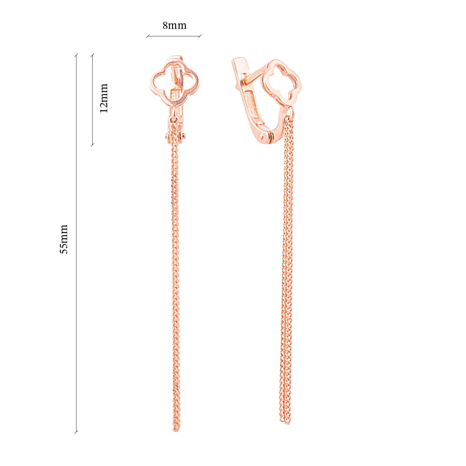 Витончені сережки з підвісками створюють враження легкості. Виконані з червоного золота 585 проби, вони складаються з двох частин. Основа — стилізована конюшина-чотирилисник, яка в різних традиціях символізує удачу. Доповнює композицію акуратна підвіска з двох довгих золотих ланцюжків. Вони підкреслюють красу шиї та матимуть гарний вигляд як із зібраним, так і з розпущеним волоссям. Під час ходьби ланцюжки плавно рухаються. Англійський замок із клямкою надійно утримує прикрасу на місці й не відвертає увагу від дизайну.