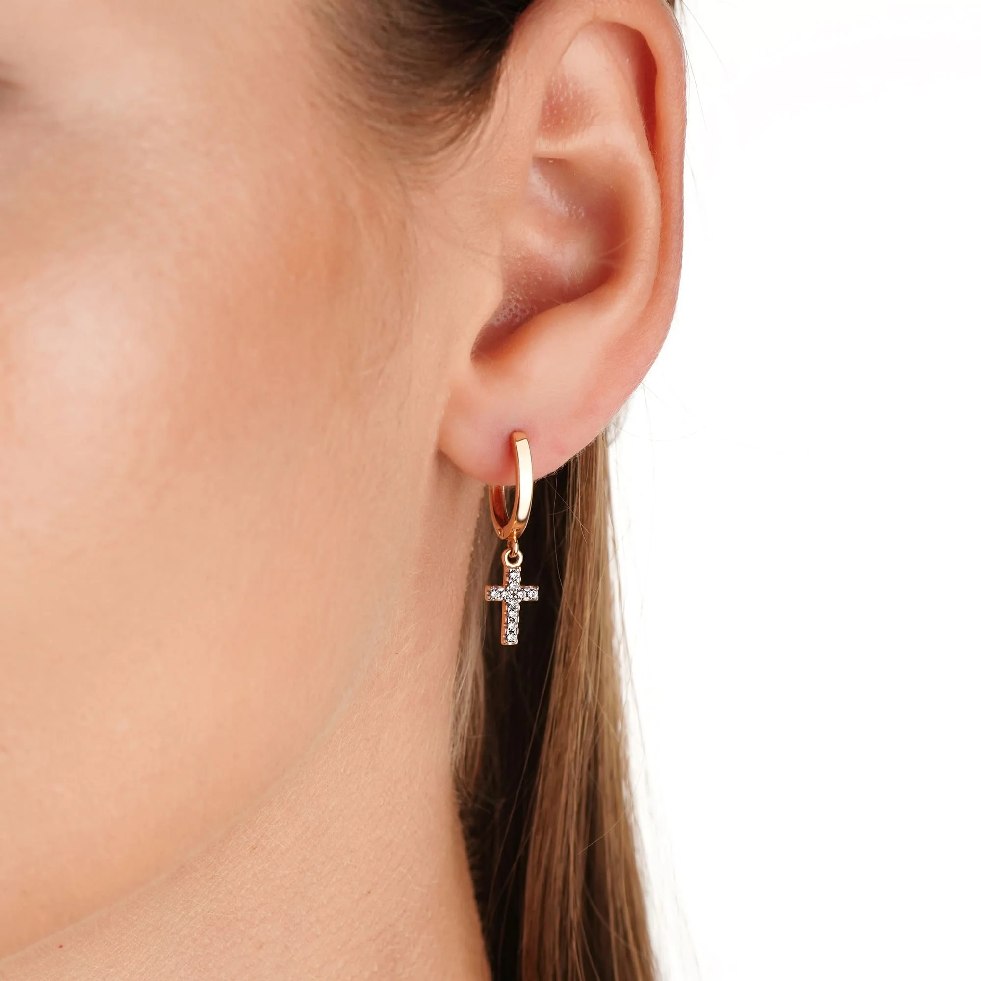 Сережки-кільця з фіанітами і підвісним серцем з червоного золота - 1562140