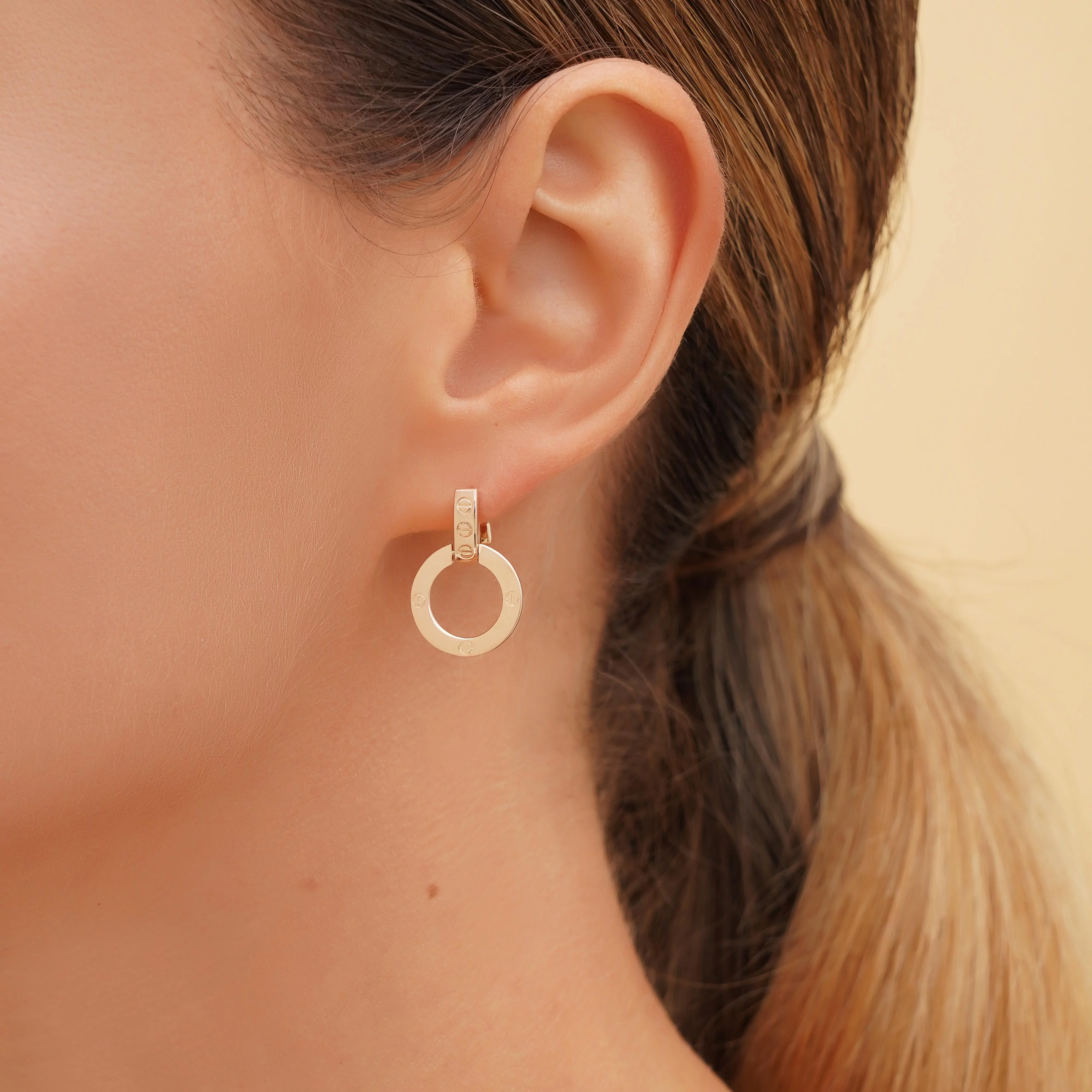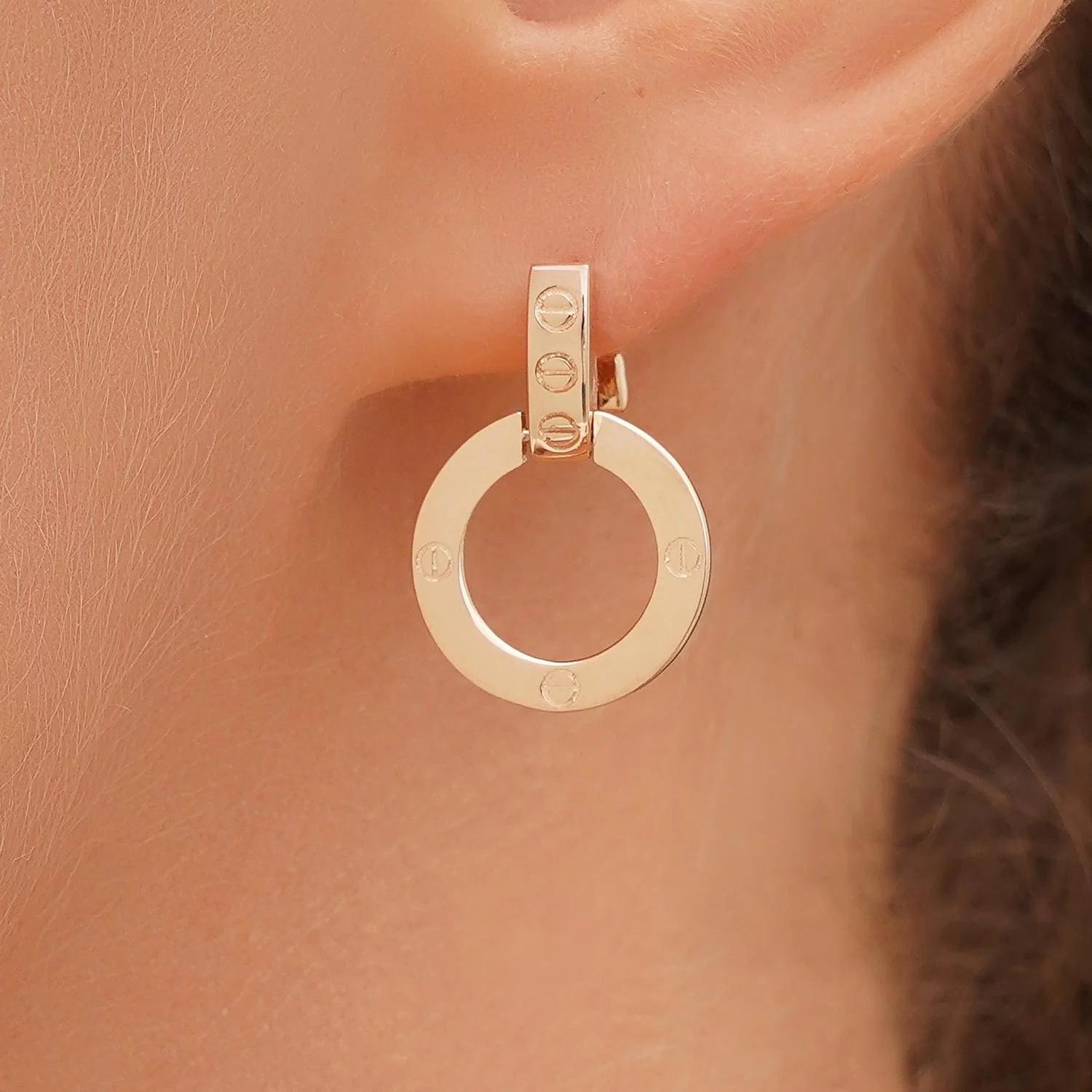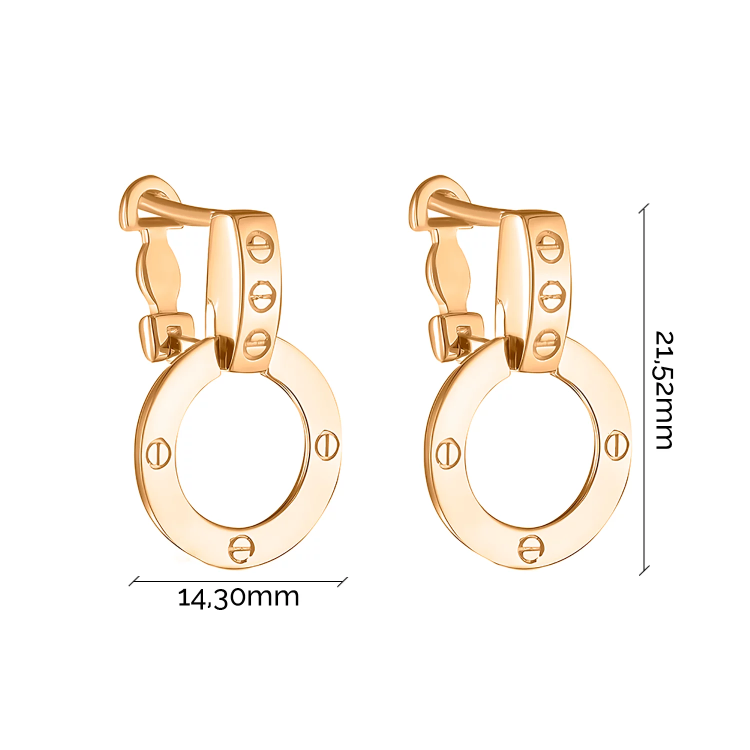 Золоті сережки "Love" - як архітектура в мініатюрі. Поєднання кола і прямокутника створює відчуття конструктивної строгості, але при цьому залишається елегантним. Гравірування у вигляді гвинтів - несподіваний штрих, який додає індустріального характеру, але не позбавляє прикрасу витонченості. Золото виглядає насичено, з теплим блиском, а полірування підкреслює геометрію. На вухах сидять впевнено, застібка надійна, нічого не бовтається і не чіпляється. Це сережки, які не просто доповнюють образ - вони його формують. Особливо добре розкриваються в мінімалістичних нарядах: біла сорочка, чорний топ, строгий жакет. У них є сила, але без агресії - як впевненість, виражена в формі.