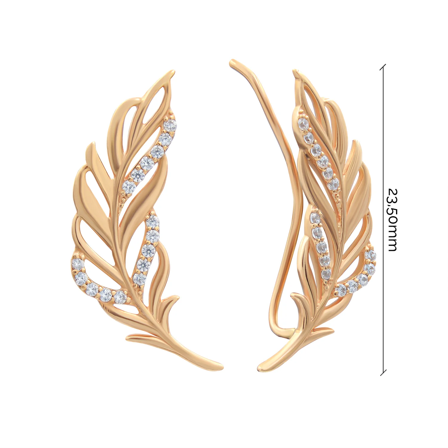 Сережки-кафи "Пір'я" з фіанітом з червоного золота - 773327