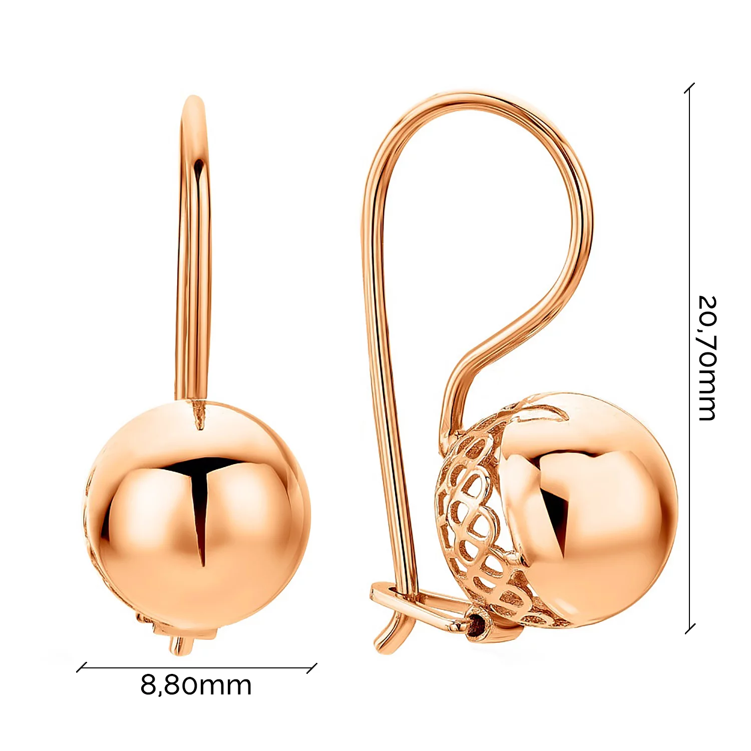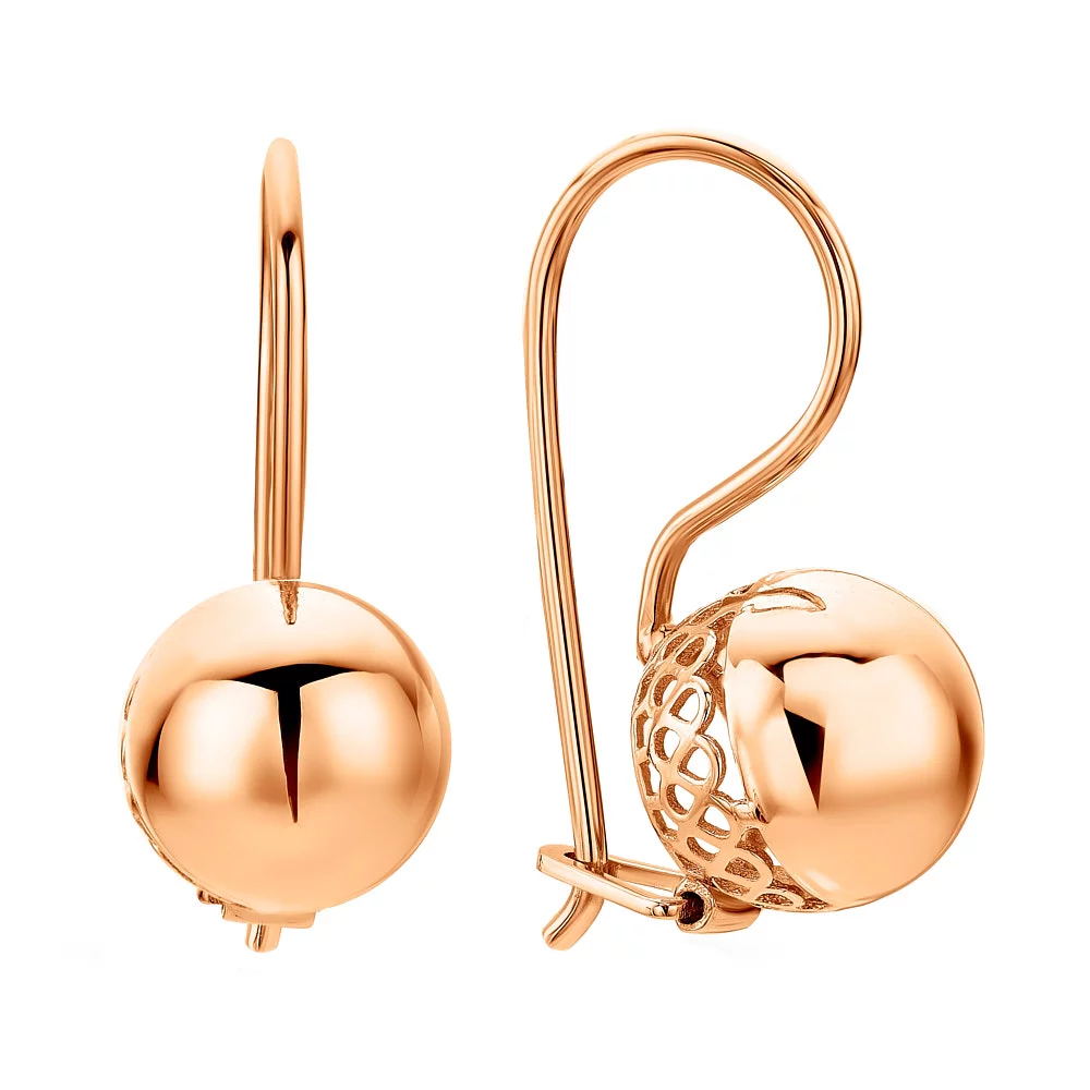 Універсальна прикраса на кожен день — сережки з червоного золота у формі кульок. Виготовлені з еталонного ювелірного сплаву 585 проби, що на 58,5% складається з дорогоцінного металу та на 41,5% — із міді. Конструкція полегшена, з сітчастим орнаментом по внутрішньому краю. Класична французька застібка наголошує на плавних лініях виробу. Привертають увагу насичений колір прикраси і полірована поверхня, що відбиває світло. Сережки добре виглядатимуть із класичним повсякденним і діловим одягом, але складуть не менш вдалий ансамбль зі святковим вбранням.