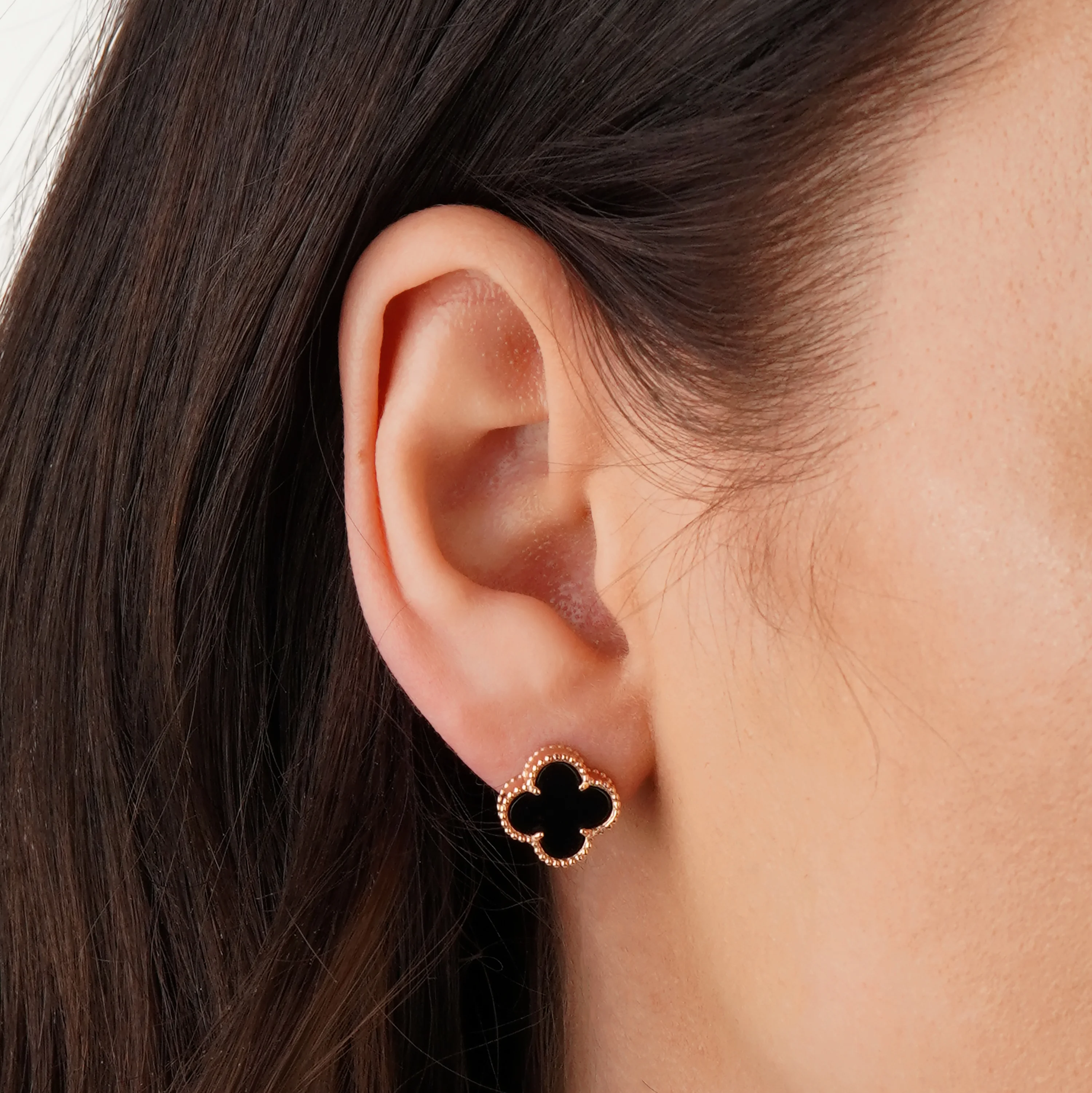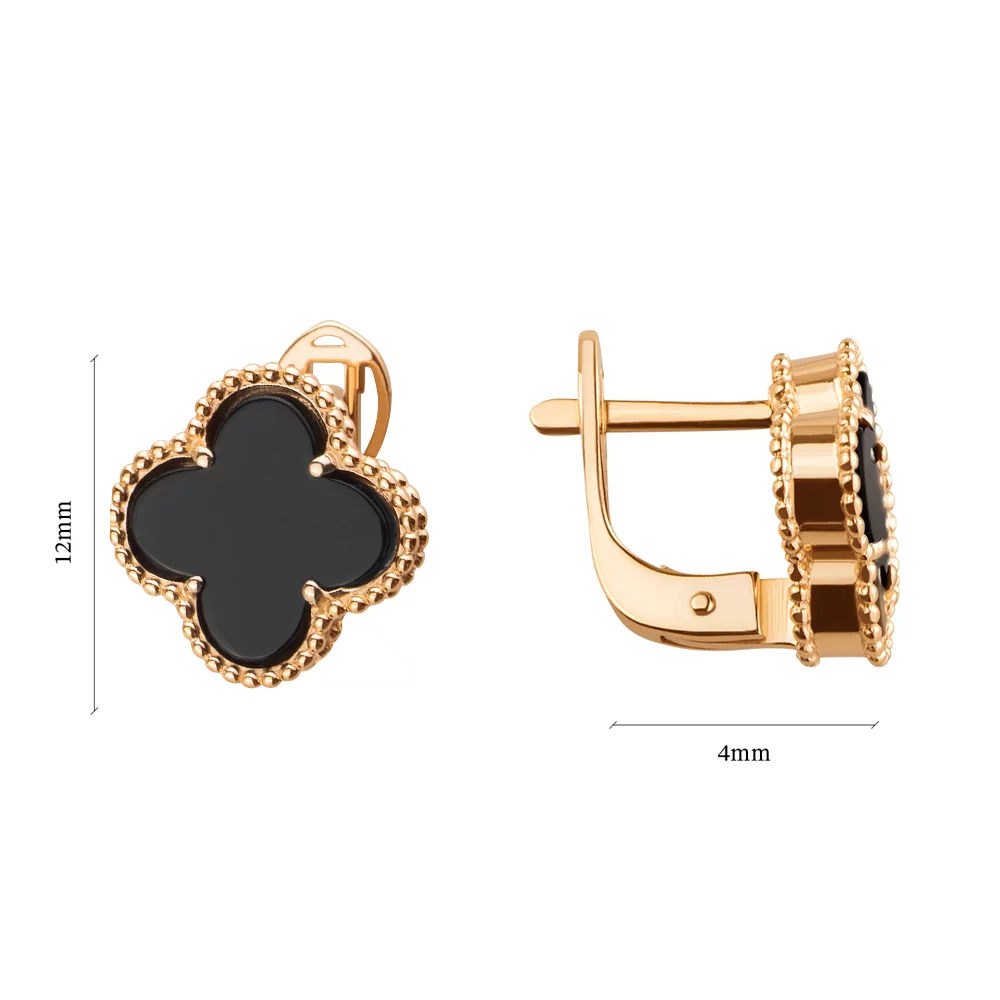 Стильні сережки-протяжки "Конюшина" з жовтого золота з оніксом - 1872762