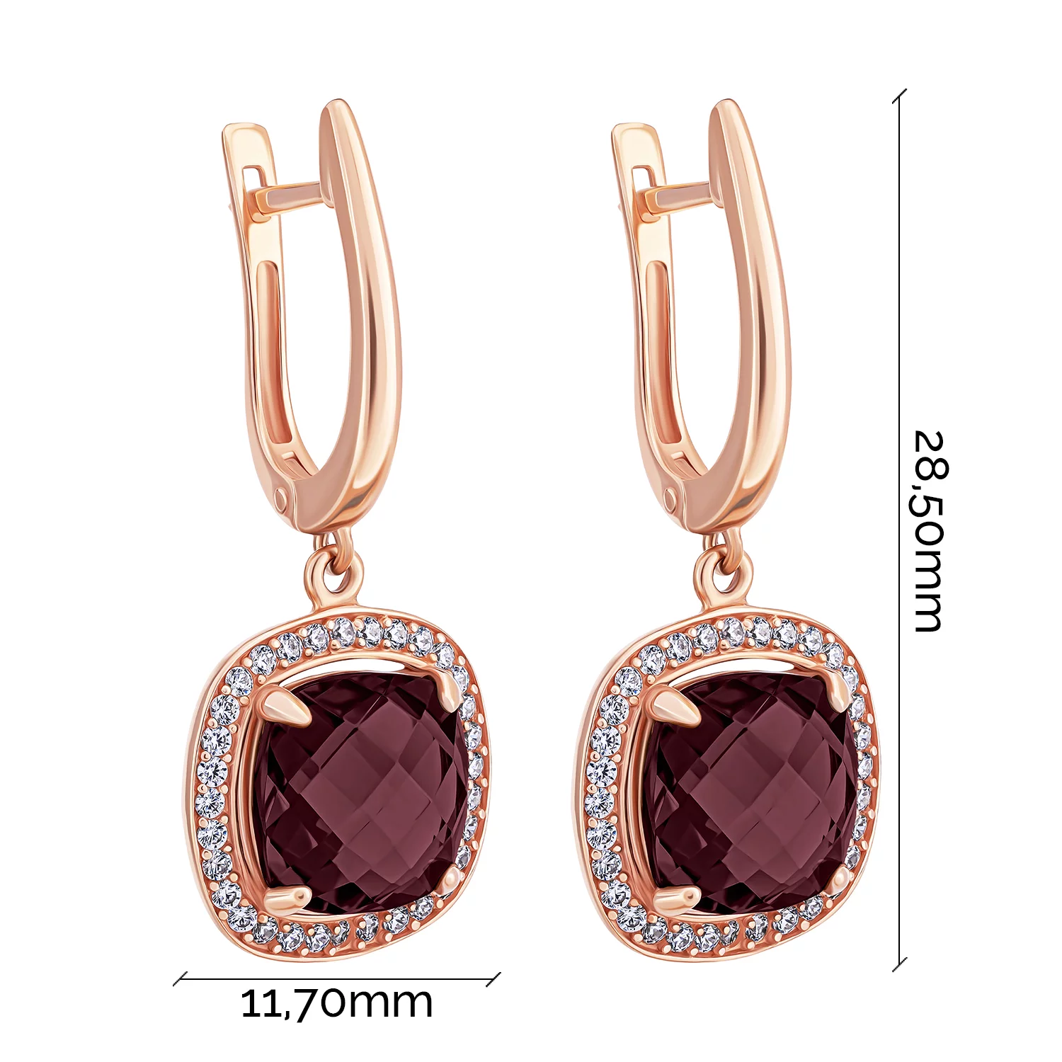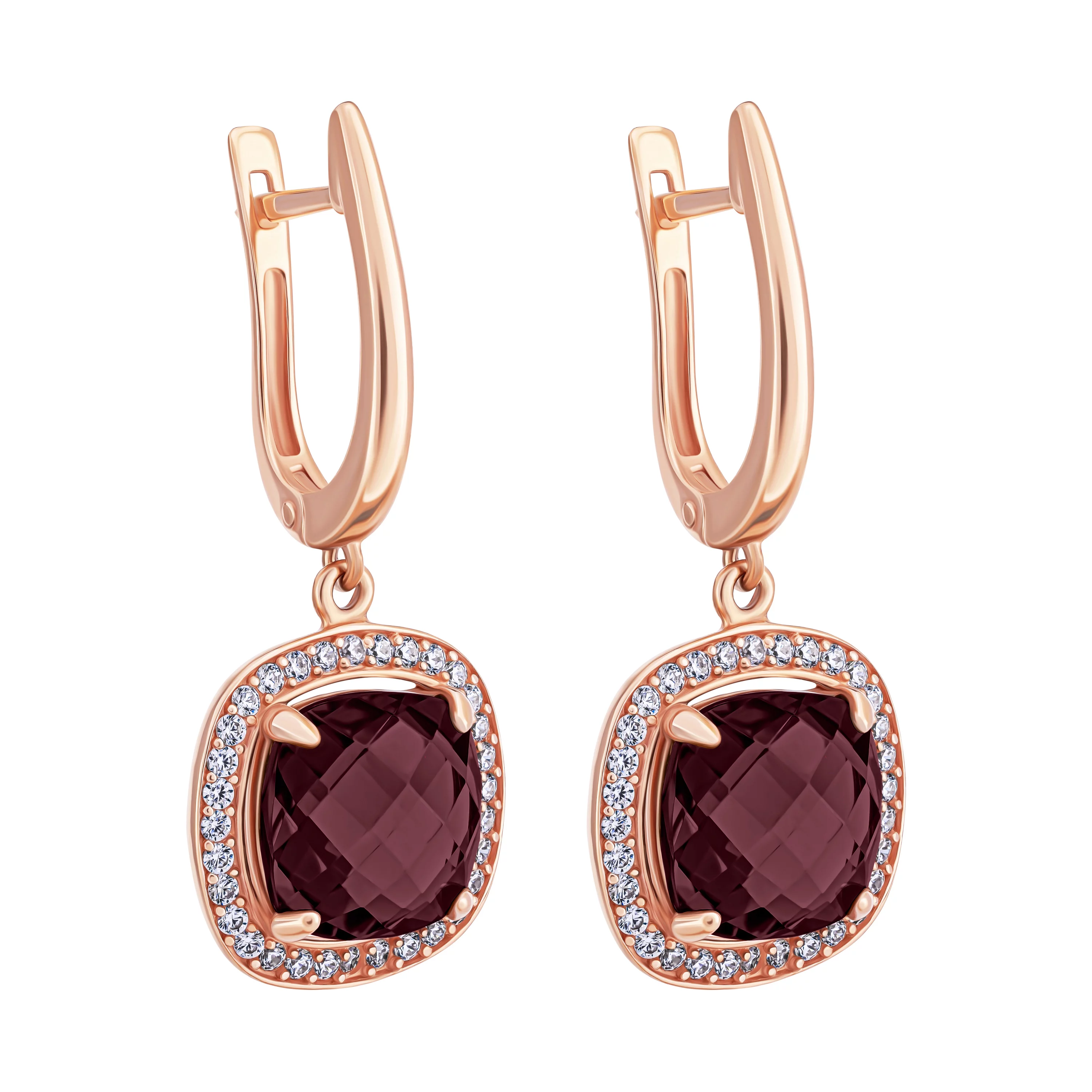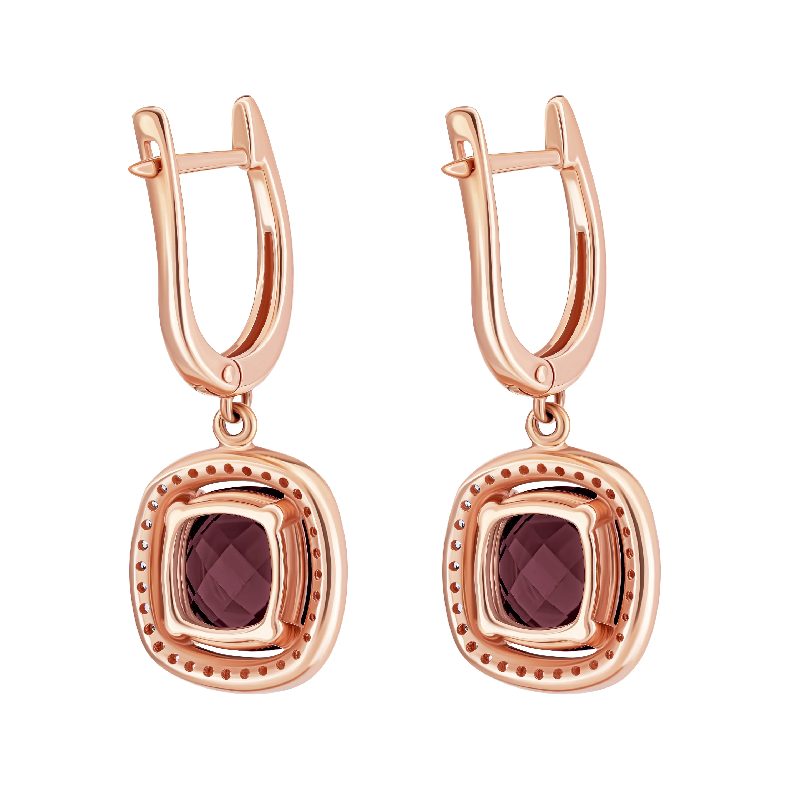 Сережки "Квадрат" у червоному золоті з гранатом та фіанітами - 1925554