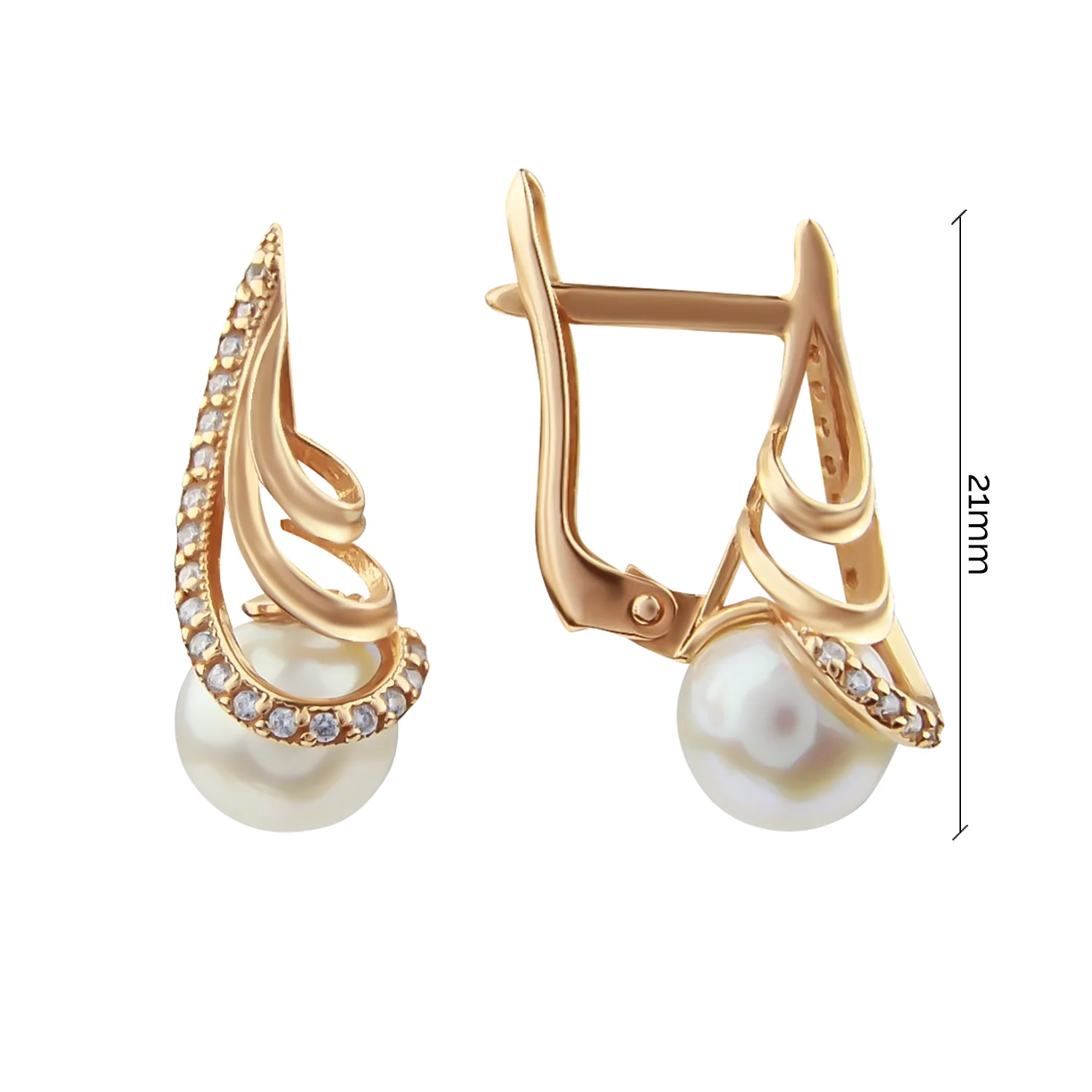 Сережки у формі листочка з червоного золота з перлиною і фіанітами - 1630904